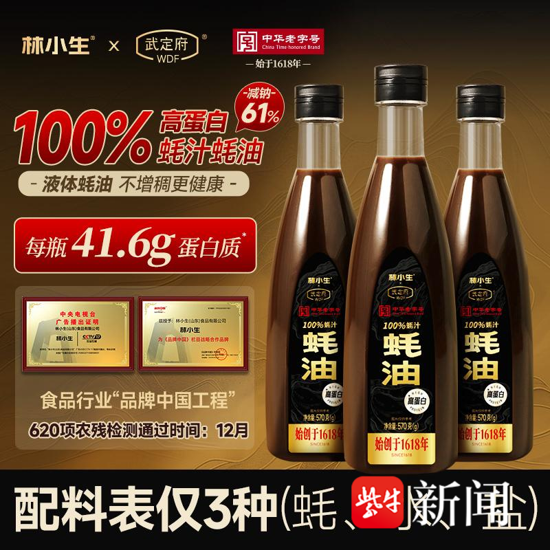 创立于2019年的林小生,是国内健康调味领域的知名新生力量。其明星产品“林小生100%蚝汁蚝油”,以极简配方开创了“纯净蚝油”这一健康美味新品类。该产品注重保留蚝汁的天然鲜味,配料表仅含蚝、水、食用盐,不含任何添加剂,问世以来快速登顶各大电商平台榜单。区别于传统蚝油的浓稠质地,林小生100%蚝汁蚝油系列产品由于采用“极简配料”,蚝油的流动性更强,故又有“液体蚝油”的称号。