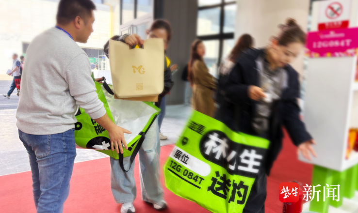 作为线上营销起家的新锐品牌,林小生在本届展会上的视觉设计别具匠心。其展位以品牌标志性的清新绿色为主色调,搭配通透明亮的灯光设计。尤为引人注目的是,林小生为参会者特别准备的鲜绿色超大容积尼龙袋,凭借其出色的实用性与品牌辨识度,迅速成为展会现场的爆款“配饰”。