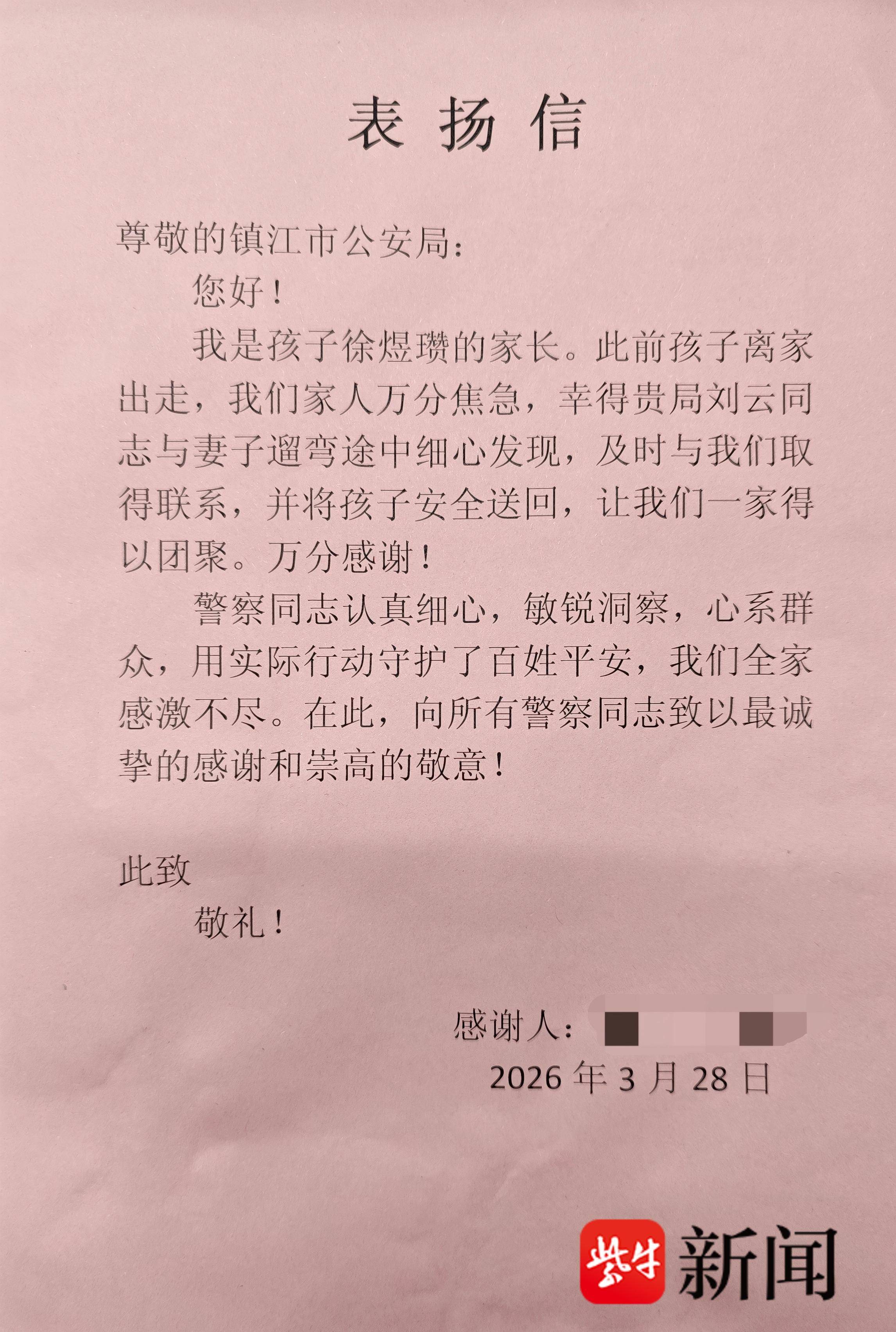 扬子晚报网4月1日讯(通讯员 唐丽玲 记者 姜天圣)3月28日上午,镇江市公安局传达室收到一面锦旗和一封表扬信。信中写道:“孩子离家出走,我们家人万分焦急,幸得贵局刘云同志与妻子遛弯途中细心发现,及时与我们取得联系,并将孩子安全送回。”然而,工作人员辗转询问多个部门,却找不到一位叫“刘云”的民警或者辅警。原来,一场误会的背后,藏着一段温暖的故事。
