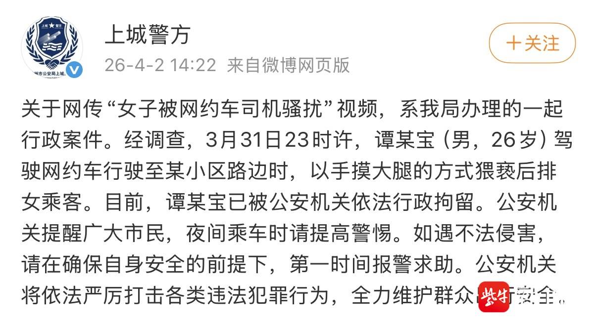 4月2日,扬子晚报/紫牛新闻记者注意到,杭州市公安局上城分局就此事发布警情通报:“关于网传‘女子被网约车司机骚扰’视频,系我局办理的一起行政案件。经调查,3月31日23时许,谭某宝(男,26岁)驾驶网约车行驶至某小区路边时,以手摸大腿的方式猥亵后排女乘客。目前,谭某宝已被公安机关依法行政拘留。”