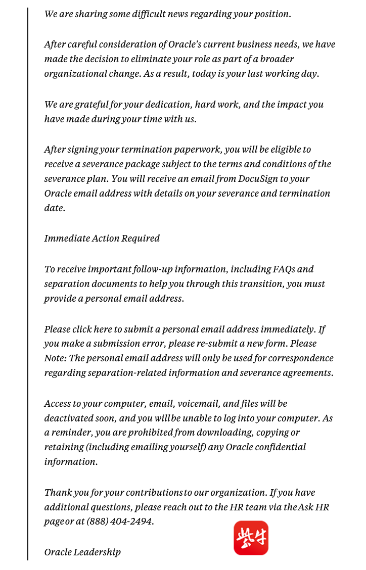 据媒体获取的一份内部解聘邮件副本显示,甲骨文在通知中写道:“经过对当前业务需求的慎重考虑,我们决定撤销您的职位,这是公司更广泛的组织架构调整的一部分。因此,今天将是您的最后工作日。”有受影响员工透露,解聘通知于太平洋时间凌晨3点发送,发送后员工随即被解除内部系统访问权限。