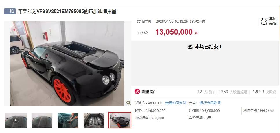日前,一辆布加迪威航跑车以600万元起拍价在阿里法拍平台拍卖,因法院公告提醒该车不具备上牌登记资格、不得非法上路行驶,引发关注。近日,扬子晚报/紫牛新闻记者注意到,这辆跑车以1305万元被拍走。