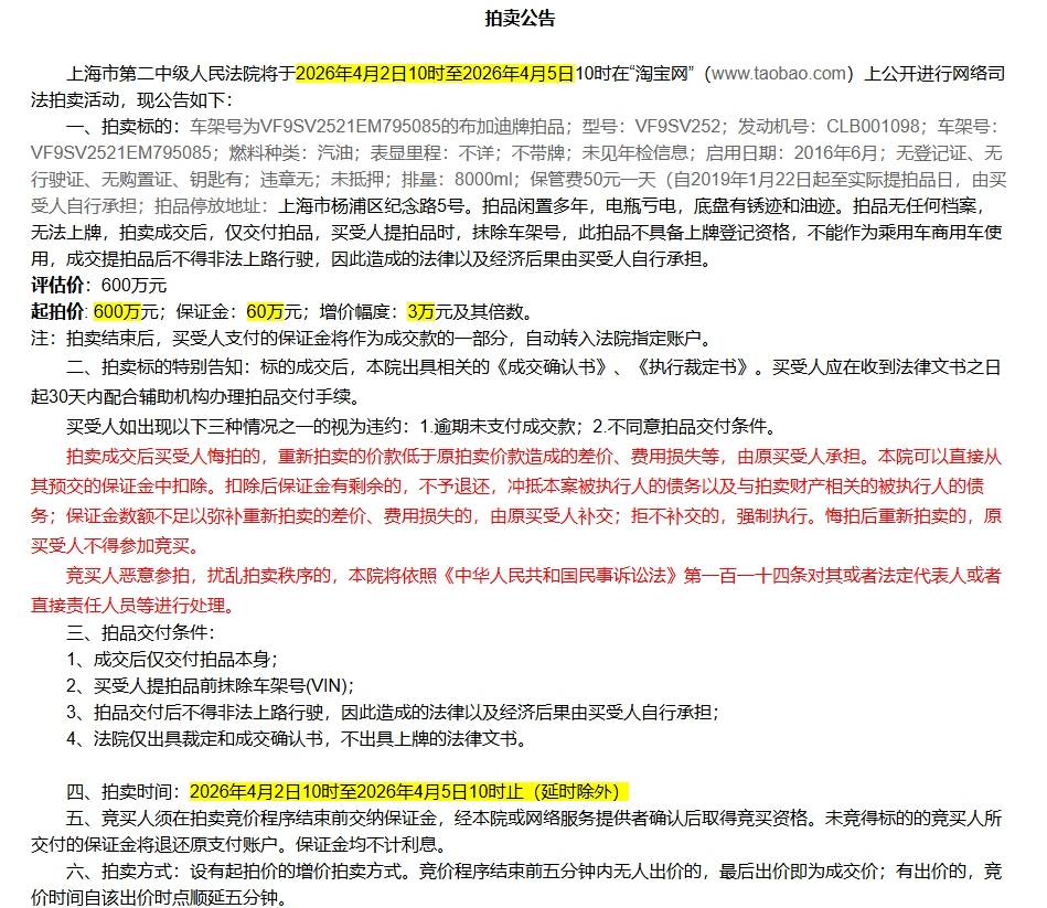 此外,该标的物的资产评估报告也提到,根据评估人员取得的资料显示,该布加迪威航跑车(原车牌号为京QJ79E7),曾因为ECU接口读取的车辆识别代号与车辆刻印的以及进口证明书记载的车辆识别号不一致,不符合相关法律规定,未能办理转移登记手续。本次评估结论已考虑了以上情况对车辆价值的影响,资产评估基准日为2025年7月8日,最后估价为600万元,评估结论有效期为一年。