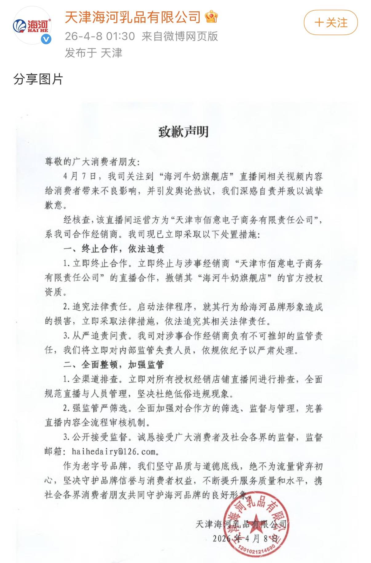 致歉声明中称,公司关注到“海河牛奶旗舰店”直播间相关视频内容给消费者带来不良影响,并引发舆论热议,公司深感自责并致以诚挚歉意。经核查,该直播间运营方为“天津市佰意电子商务有限责任公司”,系公司合作经销商。