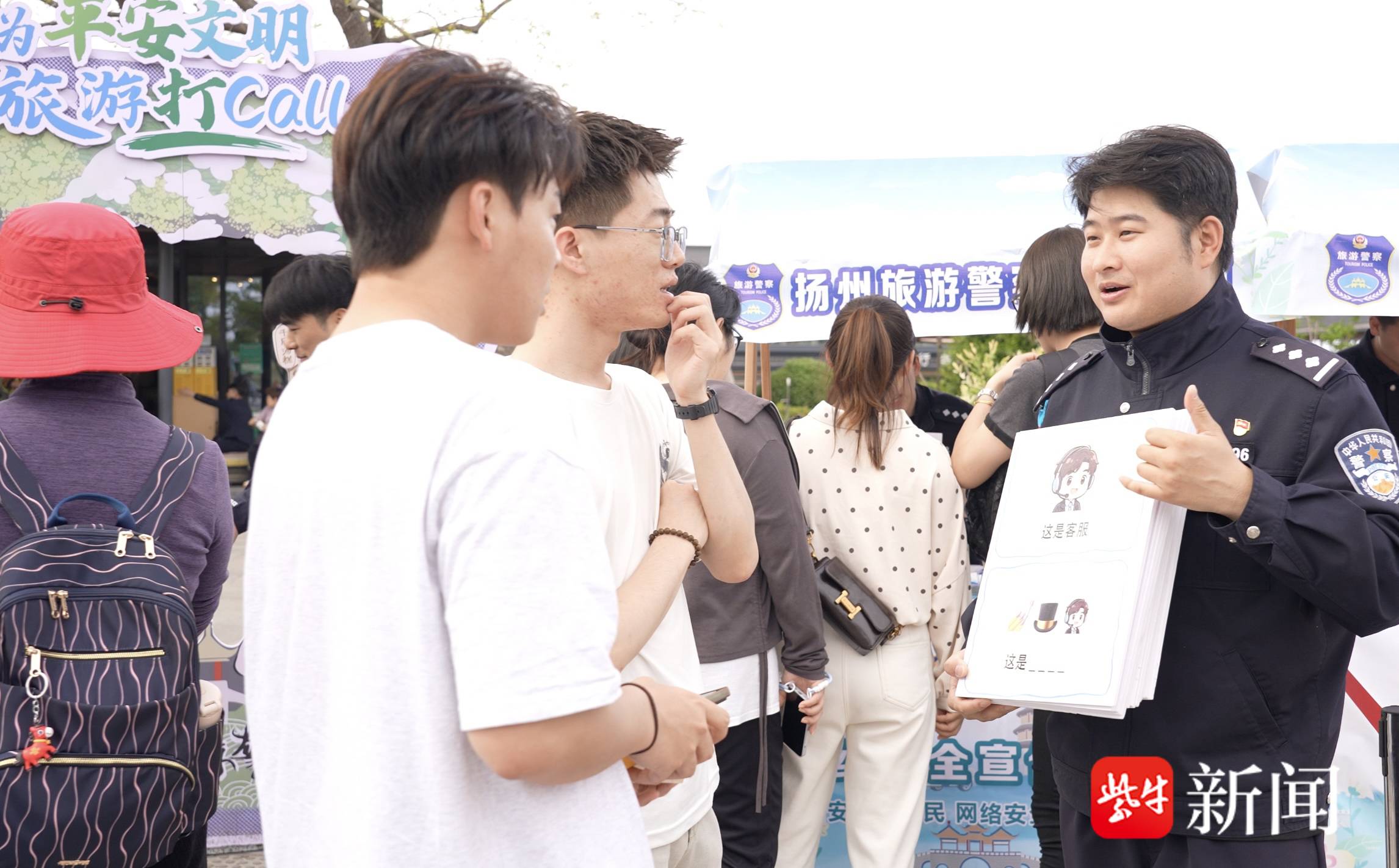 春暖花开,文旅大市扬州迎来客流高峰。该市运河三湾风景区游人如织,如画风景中,一抹“警察蓝”格外醒目。4月15日下午,一场以“护航运河文旅 筑牢平安防线”为主题的联合宣传活动火热开展。扬州景区公安分局运河三湾派出所、刑侦大队、网安大队民警组团“摆摊”,将国家安全、网络安全、旅游安全、反诈防骗、生态保护、文明养犬等知识“打包”送到游客身边。