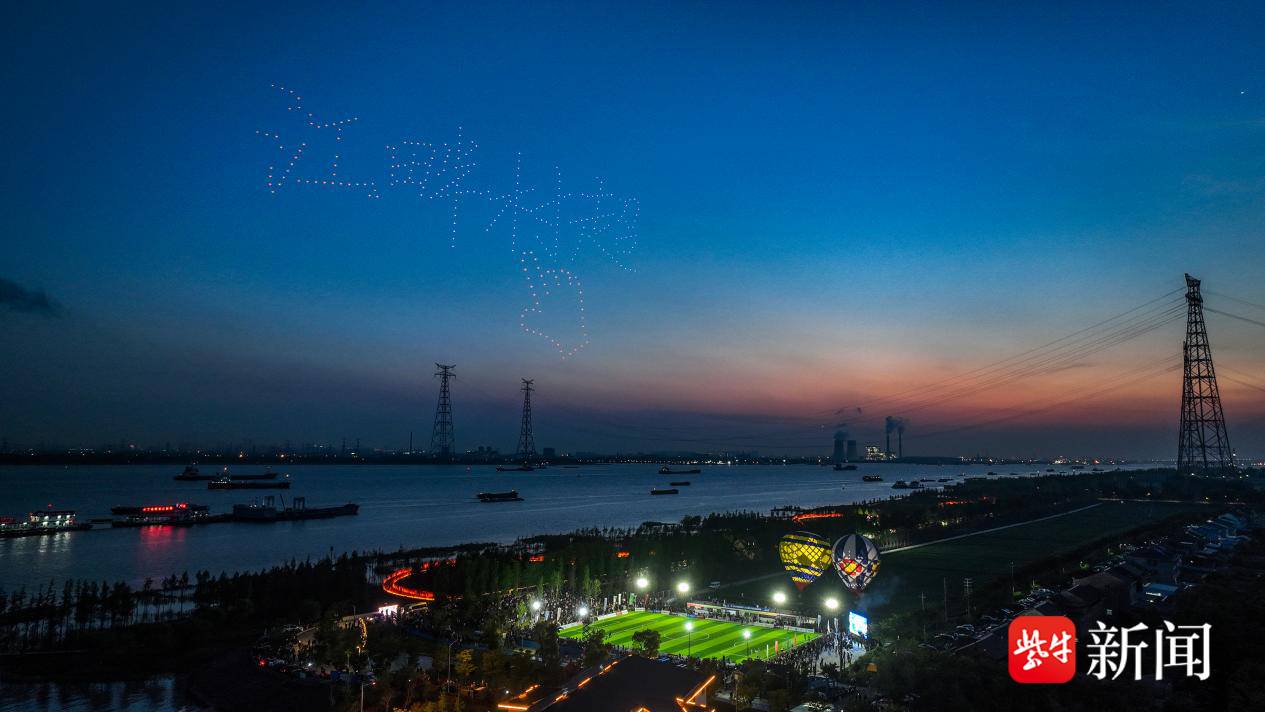 绿茵赛场激情澎湃,江畔风光岁月静好。来自各地的观众漫步在新合村江畔彩虹桥,欣赏长江日落,邂逅芦苇湿地,打卡世界最高输电铁塔,体验宝藏乡村的“诗与远方”。精彩比赛中,五彩斑斓的靖江本土品牌热气球带来浪漫氛围,展现出靖江低空经济活力;300架无人机编队以浩瀚夜空为幕,光影流转间将村超赛事主题、靖江特色名片一一铺展,勾勒出靖江乡村振兴、城市欣欣向荣的壮美图景。