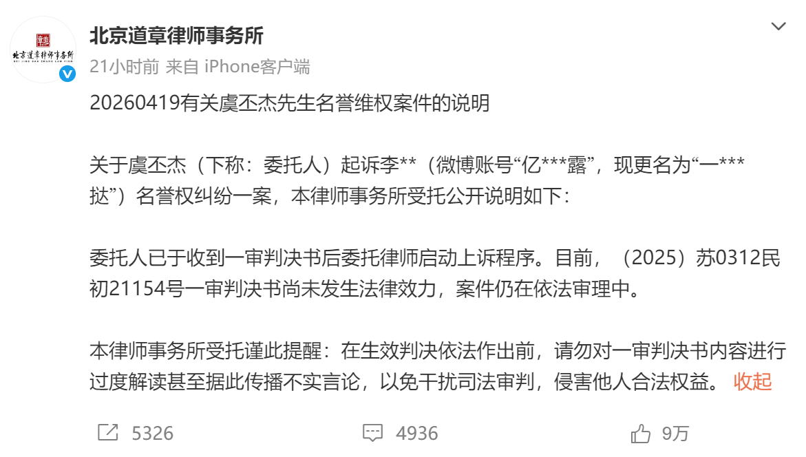 对此,虞书欣父亲律师北京道章律师事务所 发文:有关虞丕杰先生名誉维权案件的说明,关于虞丕杰(下称:委托人)起诉李**(微博账号“亿***露”,现更名为“一***挞”)名誉权纠纷一案,本律师事务所受托公开说明如下:
