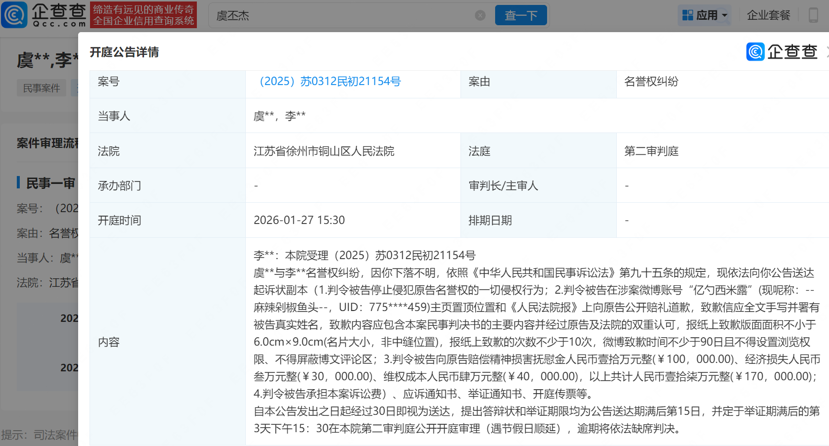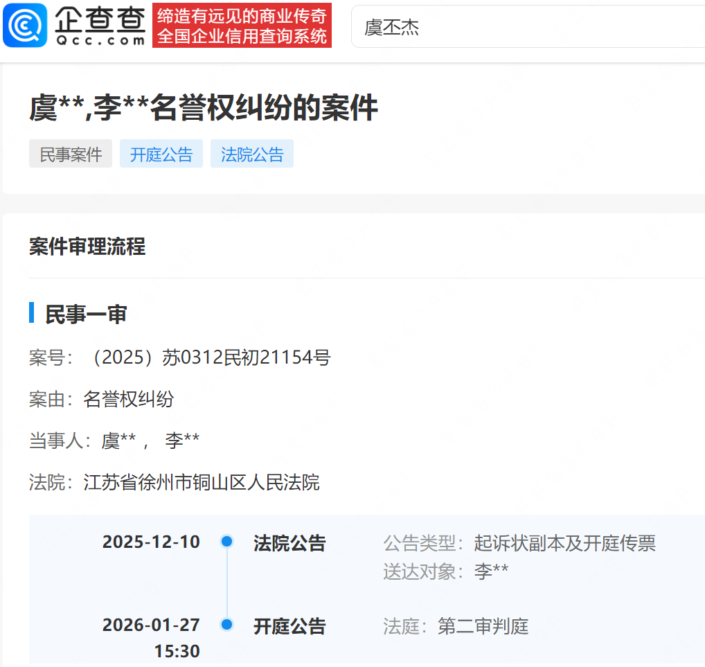 企查查APP显示,该案由虞丕杰于去年12月提起诉讼,原告要求被告公开赔礼道歉,且强调致歉信应全文手写并署有被告真实姓名,并索赔精神损害抚慰金、经济损失、维权成本等共计17万元,案件已于今年1月在江苏省徐州市铜山区人民法院开庭审理。