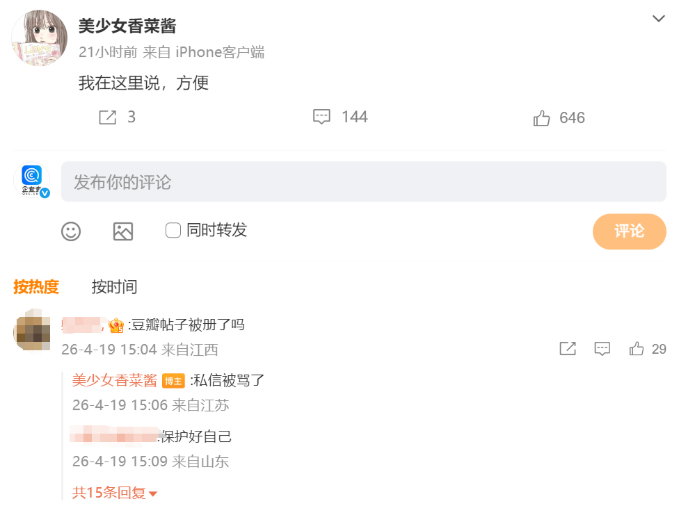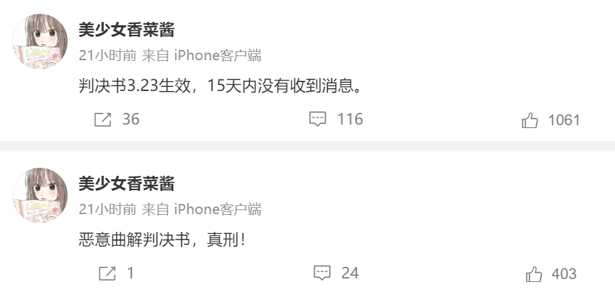 而被告@美少女香菜酱 表示,判决书已于3月23日生效,15天上诉期已过,对方声明系恶意曲解判决内容。此外,被告最初发布在豆瓣的原帖已删除,其称是因私信遭辱骂才删除。