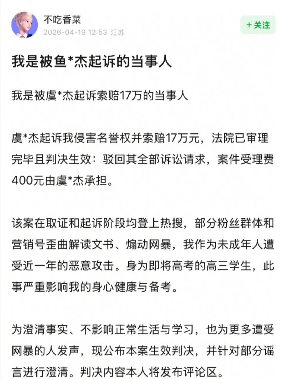 4月19日,徐州市铜山区人民法院对虞书欣父亲虞丕杰起诉一名高三学生名誉权纠纷案作出判决:驳回虞丕杰全部诉讼请求,其索赔的17万元(含精神损害抚慰金10万元、经济损失3万元、维权成本4万元)未获法院支持,并需承担400元案件受理费。
