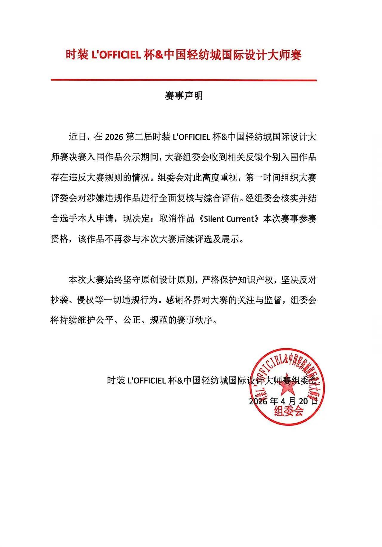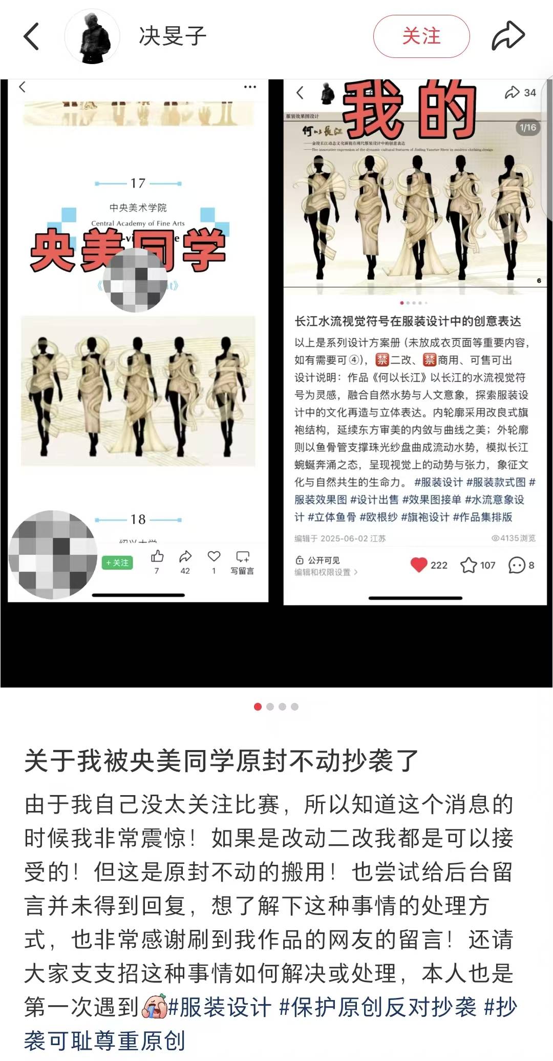 4月17日,2026中国轻纺城国际设计大师赛暨第二届时装L’OFFICIEL杯设计大师大赛公布了入围作品的效果图。有网友注意到,17号作品《Silent Current》(无声之力)与博主“决旻子”2025年6月发布的作品一模一样。