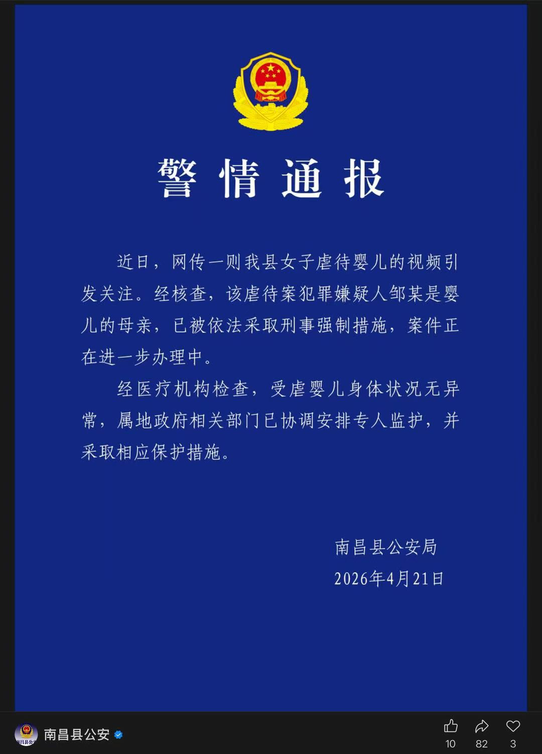 4月21日,有网友发布视频反映,江西南昌发生一起虐婴事件,相关话题引发关注。21日晚,江西省南昌市南昌县公安局发布警情通报:“近日,网传一则我县女子虐待婴儿的视频引发关注。经核查,该虐待案犯罪嫌疑人邹某是婴儿的母亲,已被依法采取刑事强制措施,案件正在进一步办理中。经医疗机构检查,受虐婴儿身体状况无异常,属地政府相关部门已协调安排专人监护,并采取相应保护措施。”