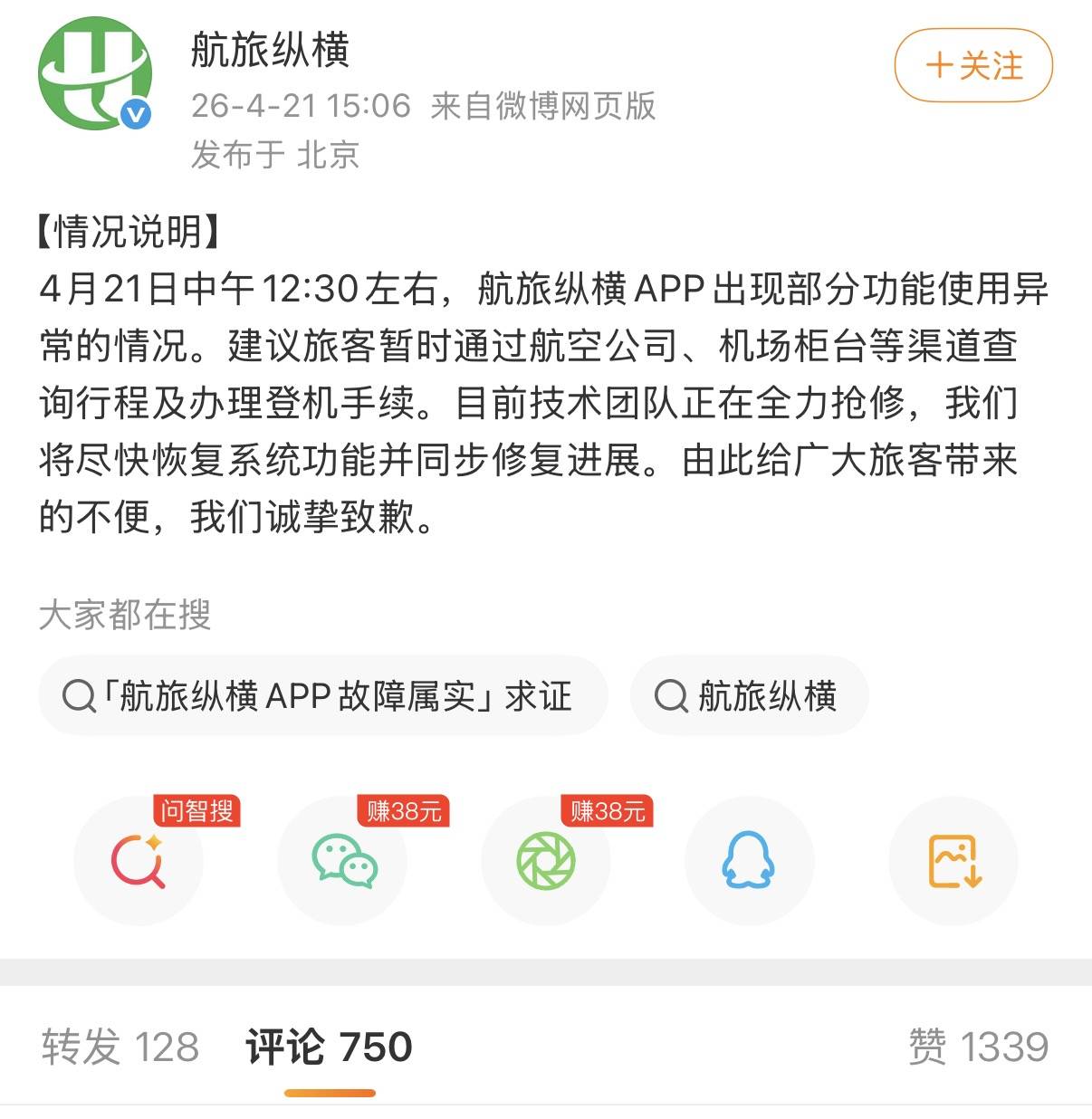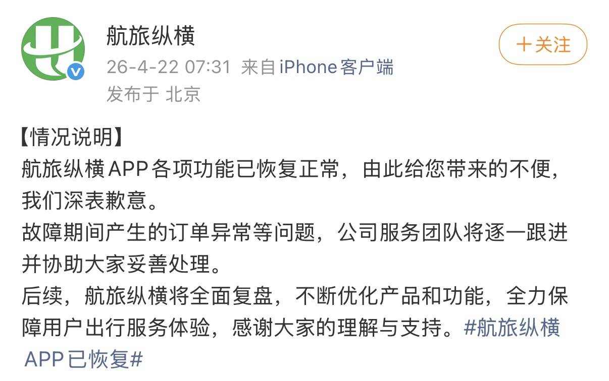 21日下午,航旅纵横在其微博账号发布致歉声明:4月21日中午12:30左右,航旅纵横APP出现部分功能使用异常的情况。建议旅客暂时通过航空公司、机场柜台等渠道查询行程及办理登机手续。目前技术团队正在全力抢修,将尽快恢复系统功能并同步修复进展。由此给广大旅客带来的不便,诚挚致歉。