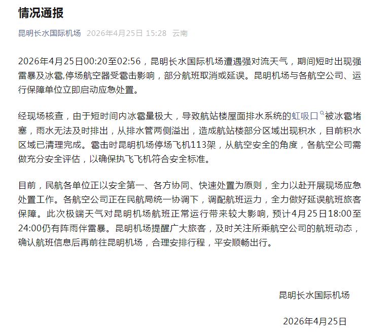 扬子晚报紫牛新闻记者注意到,就在25日下午,昆明长水国际机场发布情况通报。通报称,2026年4月25日00:20至02:56,昆明长水国际机场遭遇强对流天气,期间短时出现强雷暴及冰雹,停场航空器受雹击影响,部分航班取消或延误。昆明机场与各航空公司、运行保障单位立即启动应急处置。经现场核查,由于短时间内冰雹量极大,导致航站楼屋面排水系统的虹吸口被冰雹堵塞,雨水无法及时排出,从排水管两侧溢出,造成航站楼部分区域出现积水,目前积水区域已清理完成。雹击时昆明机场停场飞机113架,从航空安全的角度,各航空公司需做充分安全评估,以确保执飞飞机符合安全标准。