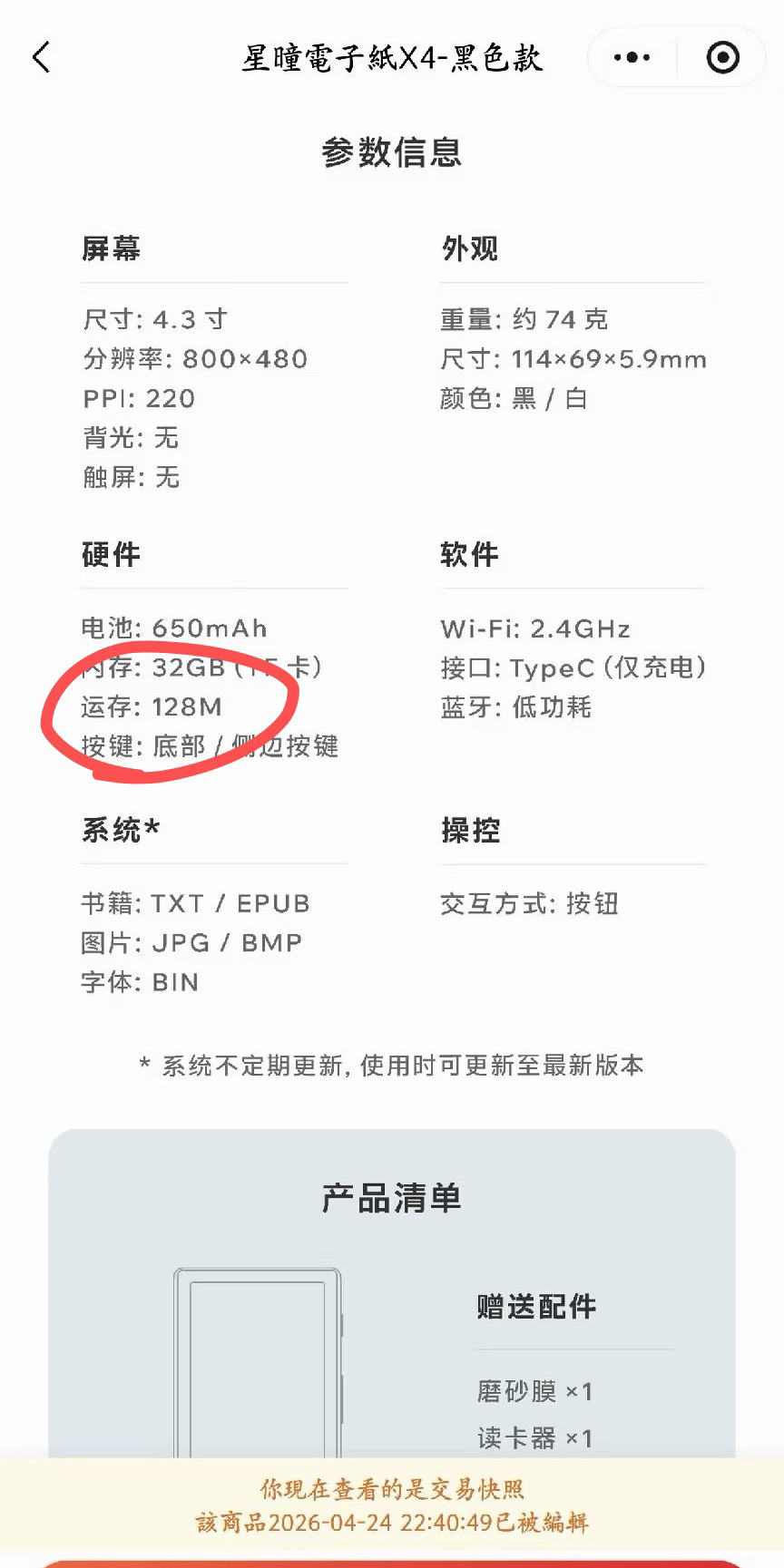 4月25日,阅星曈官方账号发布说明称,该品牌X4阅读器的实际配置为运存约400KB、闪存128Mb。品牌在初始传播物料中,误将“闪存128Mb”写为“运存128M”,后续工作过程中,流程疏漏,校对不严,此笔误被复用至多个传播触点中。