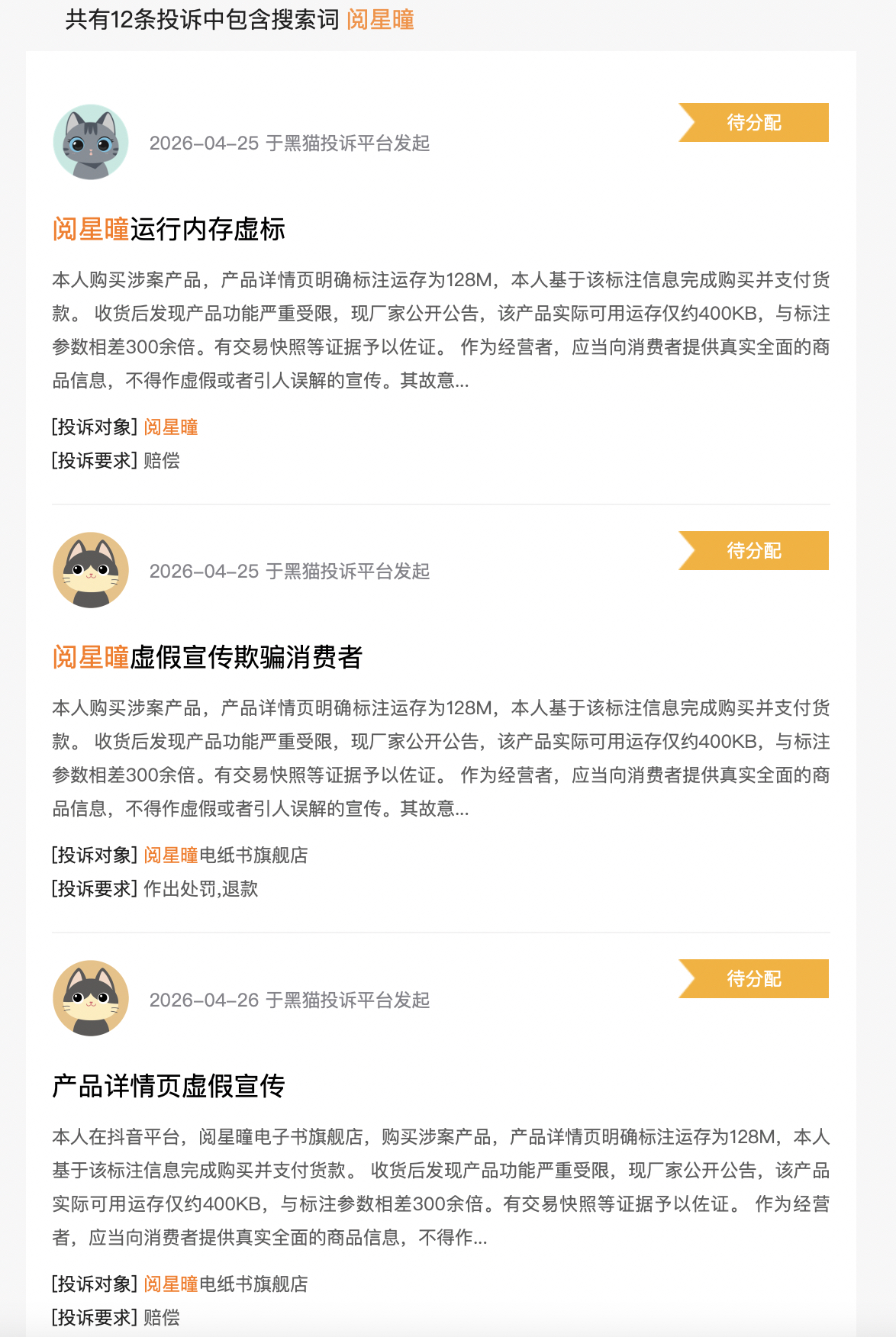 近日,扬子晚报/紫牛新闻记者注意到,有网友发帖反映,电子书阅读器品牌“阅星曈”旗下阅读器产品,商品详情页疑似错标实际运行内存,将400KB写为128M,引发消费者热议。