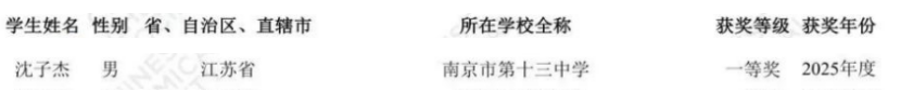 近日,南京市第十三中学传来好消息,在今年第39届中国化学奥林匹克(初赛)中,高三学子沈子杰凭借扎实的化学功底、出色的逻辑思维与不懈的拼搏精神,荣获全国一等奖!