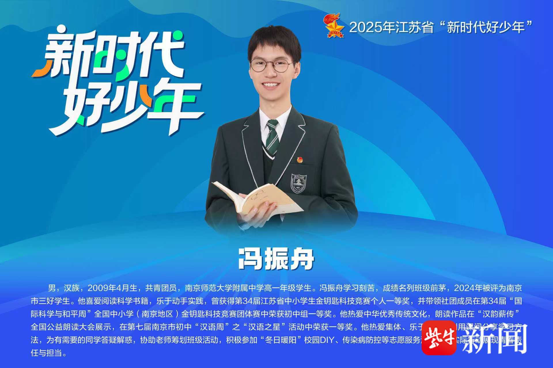 在南京师范大学附属中学的校园里,高二年级学生冯振舟是同学们眼中的“全能榜样”——他不仅学习成绩名列前茅,多次获评校“三好学生”,更在科创赛场屡获佳绩、在传统文化领域深耕不辍,还以热忱之心带动集体进步、投身公益服务,用实际行动诠释着新时代青少年的责任与担当,并成功获评2025年江苏“新时代好少年”。