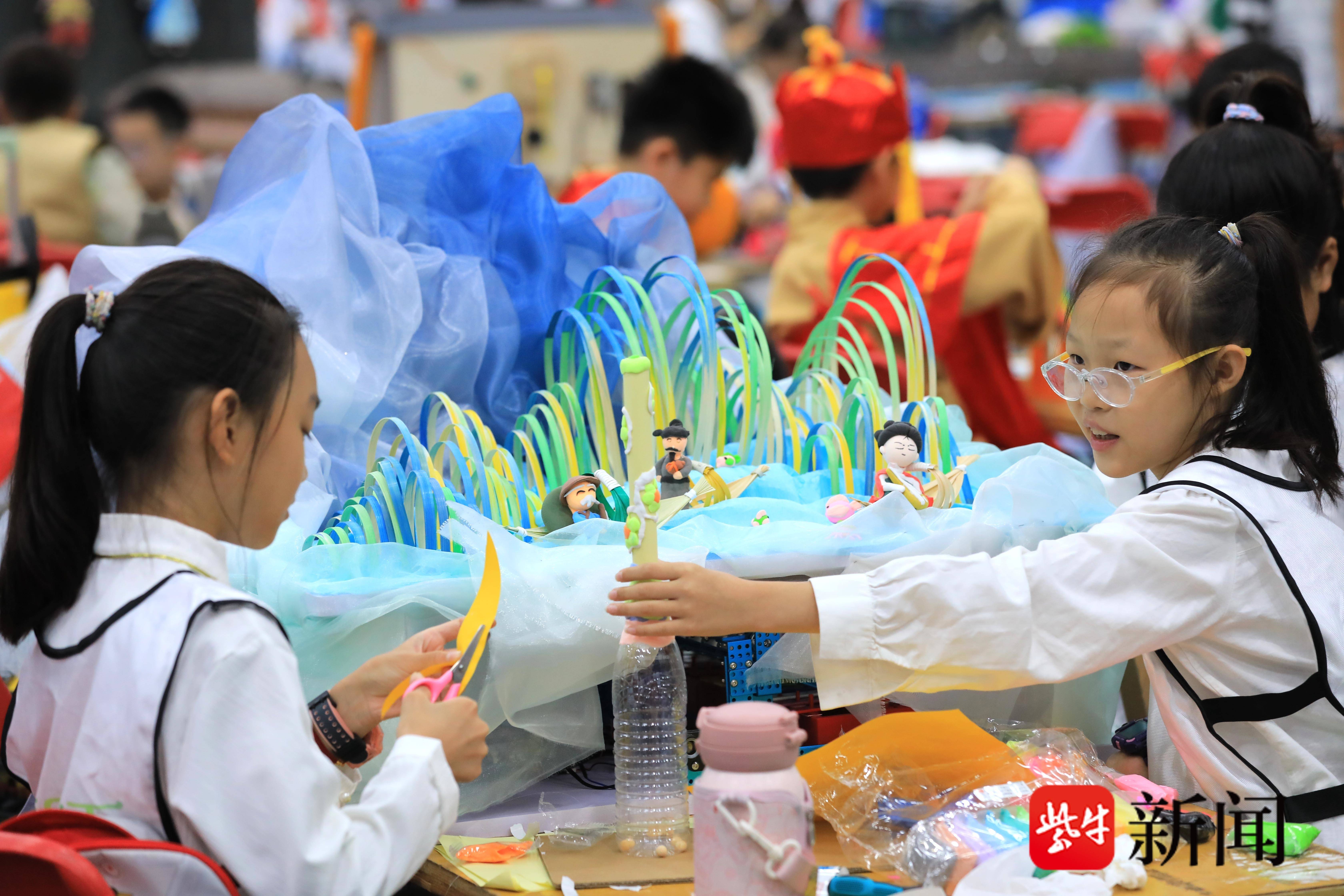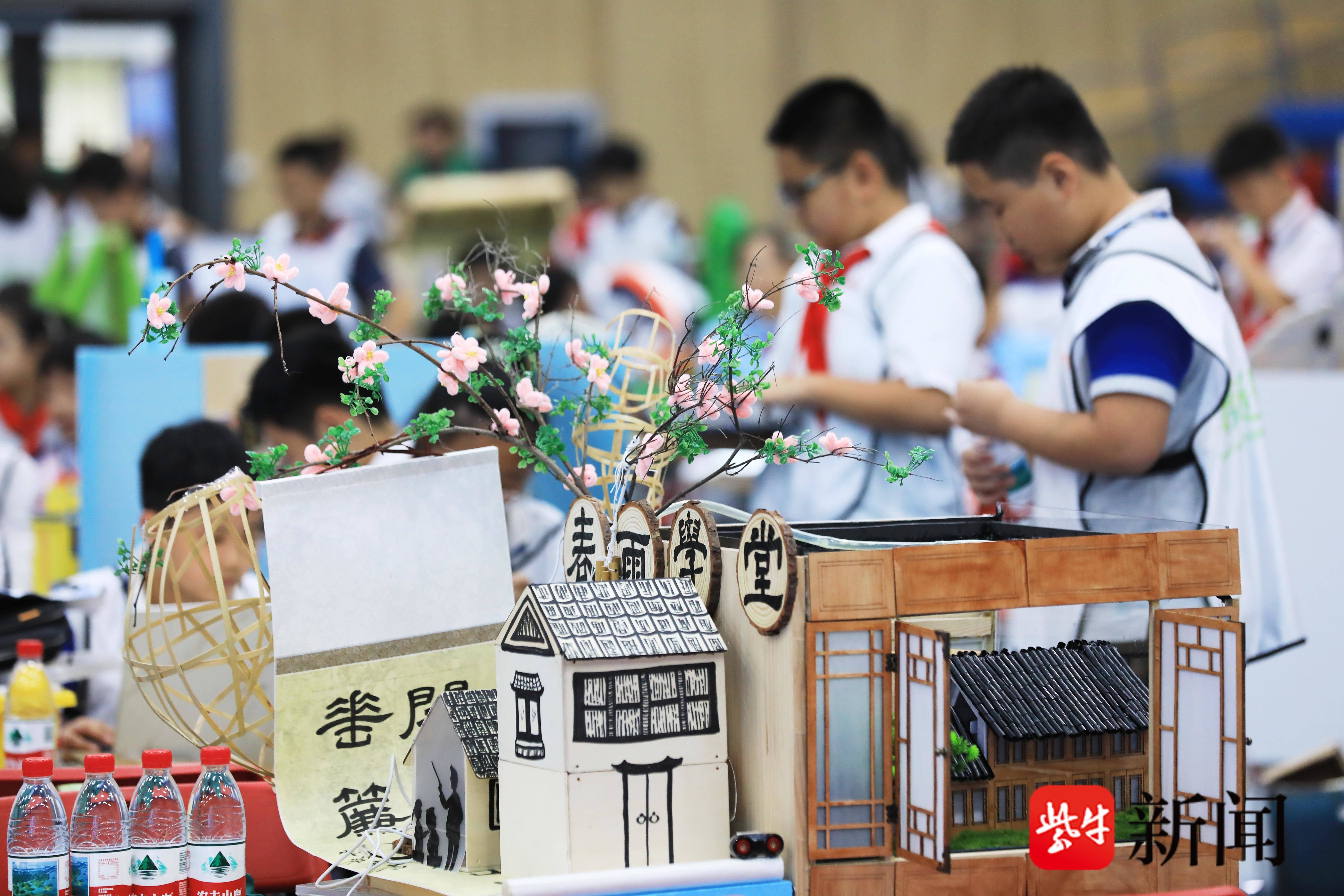 同学们的作品令人惊艳。高淳桠溪中心小学的同学们带来的作品展现了中国古代的活字印刷术,一个个立体的方块汉字展现了中华传统文化的魅力。“我们的作品主题是以文化人,活字润心,作品中用到了吹奏乐器、打击乐器和拨弦乐器,这些都是我们用废旧材料制作的,例如废弃口琴的簧片、废旧的pvc管等等。”六年级刘致远同学告诉记者,他和另一位男生主要负责智能机器人的组装、调试和作品制作,两位女生主要负责捏橡皮人,做手工乐器等。“这个作品从一开始创意到完成,我们花了一年的时间。从去年和鸣比赛结束,我们就开始构思了。”