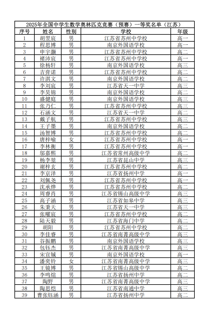 10月14日中国数学会公布了2025年第41届中学生数学竞赛江苏省队名单,共有29名数学竞赛生闯进省队,其中苏中 17 人,南外 6 人。