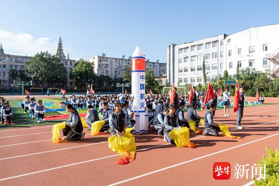 上午8时,伴随着主持人充满激情的开场,入场仪式开始。首先入场的是庄严的五星红旗方阵,南京市第五十四中学校旗紧随其后,校园吉祥物“琦琦”和“季季”引领19面班旗方阵浩荡而行。全校19个班级围绕“祖国国防科技”主题进行的创意入场式表演,一幅波澜壮阔的国防科技长卷在跑道上徐徐展开。