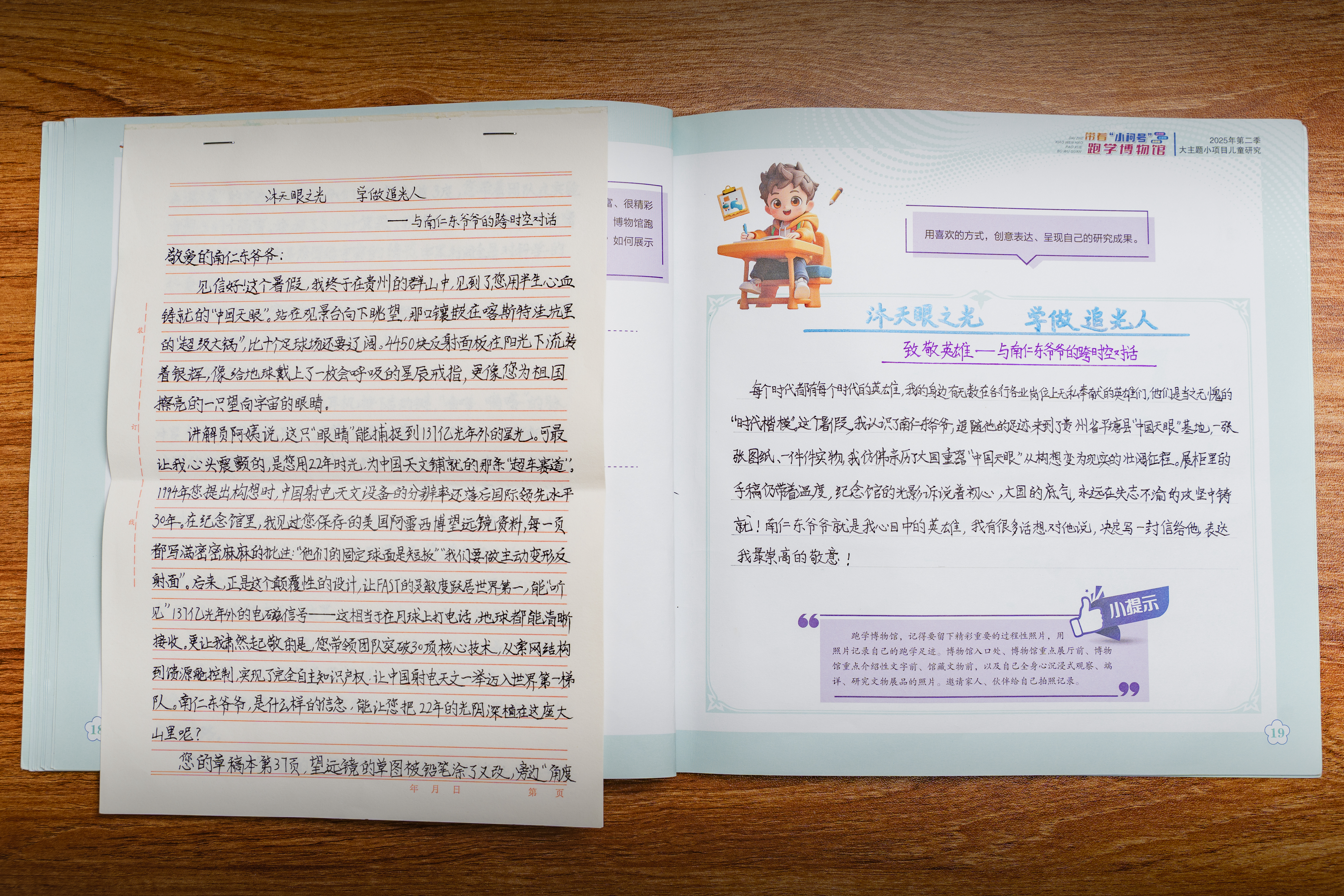 在贵州省平塘县“中国天眼”基地,刘逸轩盯着墙上的图纸、南仁东的手稿,久久没挪步:“从‘想造一个天眼’到‘天眼能看宇宙’,原来这么难!南仁东爷爷花了 22 年,再难也没放弃。他是我心中的英雄!”他的手记里记满了天文知识,还有一封特地写给南仁东爷爷的信,“以后我也想当一名科研工作者。我要学习他直面困难、永不放弃的精神。”