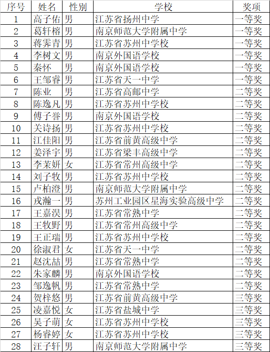 记者梳理发现,江苏学子6人获得金牌,其中南京外国语学校2人,南京师范大学附属中学、江苏省扬州中学、江苏省苏州中学校、江苏省天一中学各1人。