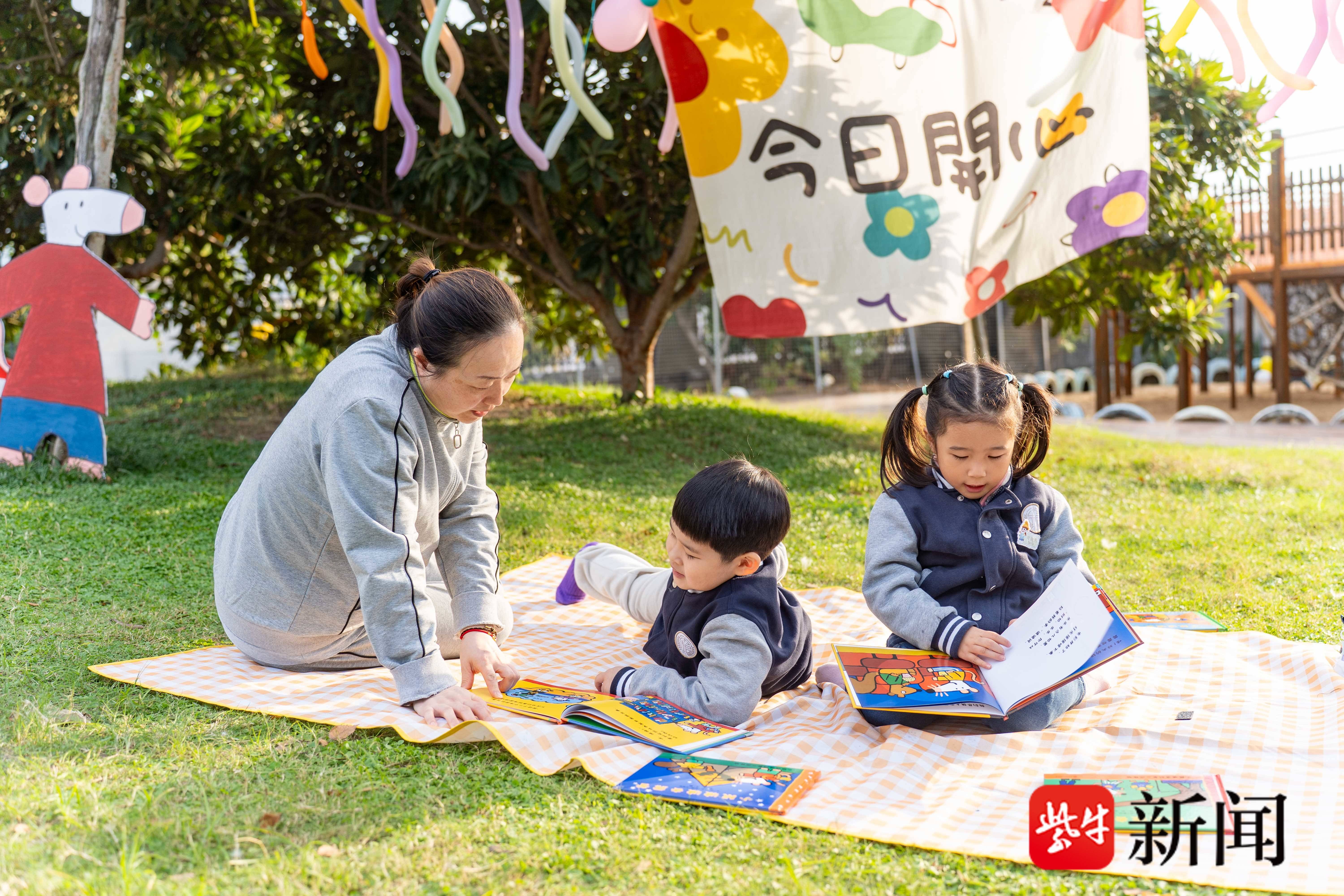 坐在草坪上讲《蚂蚁的一生》;在遍地草种的角落听老师讲《神奇种子店》;甚至脱了鞋子躺在野餐垫上,听老师讲《小鼠波波去露营》……在户外“草坪阅读”环节,孩子们惬意地晒着秋日暖阳听老师讲绘本故事。“真想躺上去!”嘉宾们直呼“羡慕”。