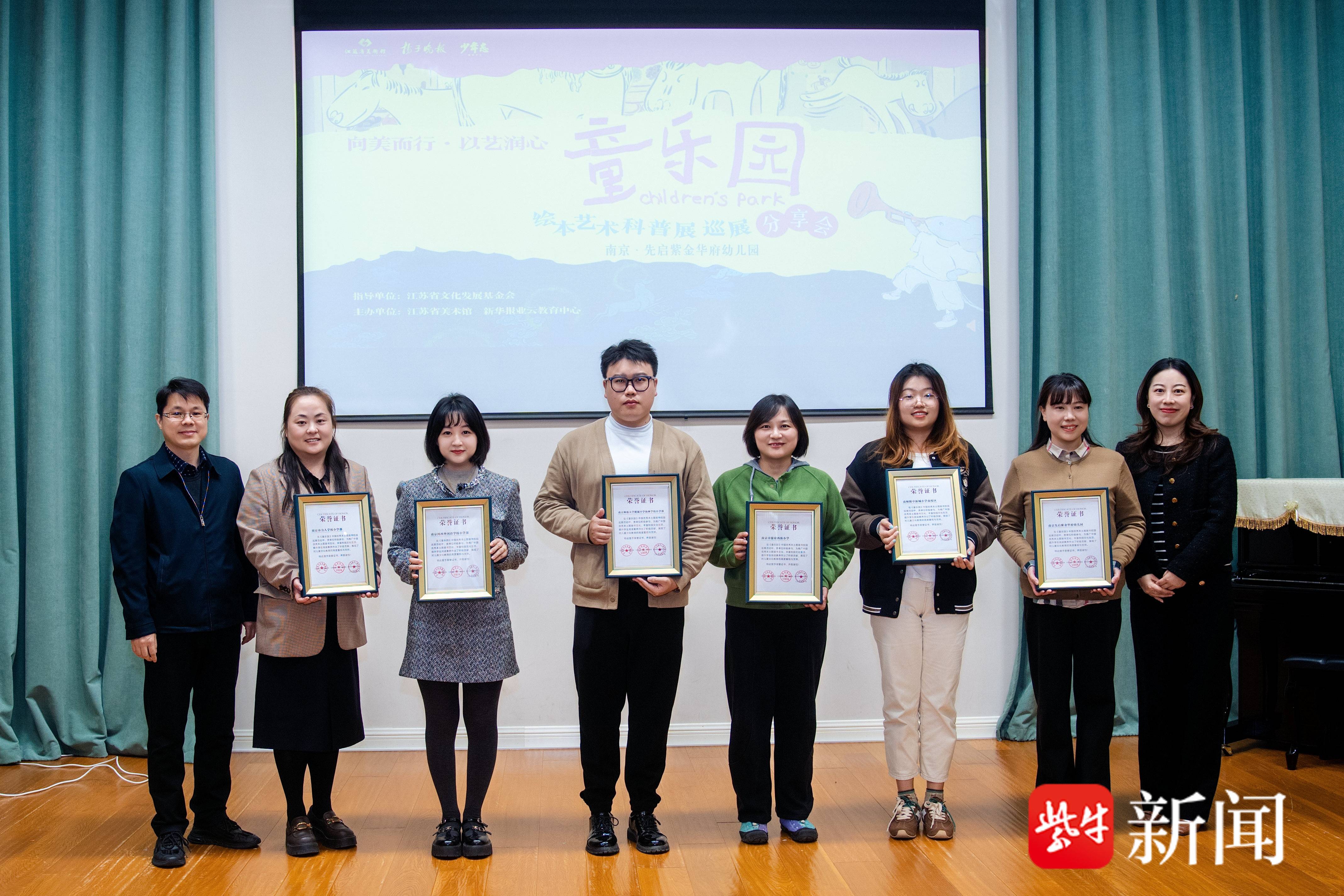 活动中,江苏省文化发展基金会秘书长孙冲(上图左一)与扬子晚报副总编辑、南京晨报总编辑王璟(上图右一)共同为参与本次《童乐园》巡展的六所学校代表颁发证书,激励各方继续为孩子搭建优质的本土绘本阅读平台。