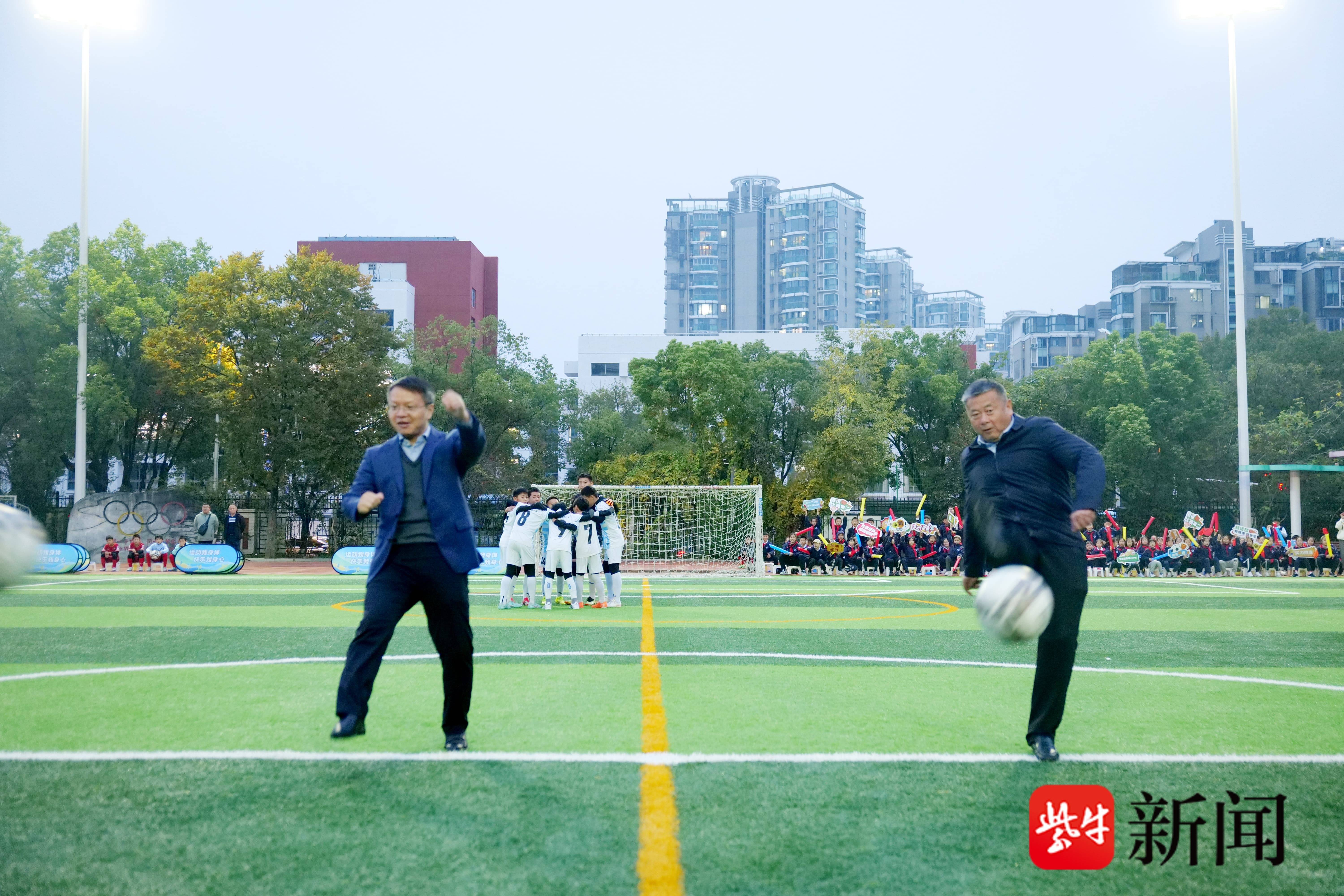 颁奖后,玄武“校超”邀请赛精彩上演,小学男子甲组冠军队南京市长江路小学与东道主南京理工大学实验小学的足球小将们帅气登场。南京市长江路小学党总支书记曹海永与南京理工大学实验小学党支部书记李子贵共同开球,两位校领导的矫健身姿为赛事增添别样风采。