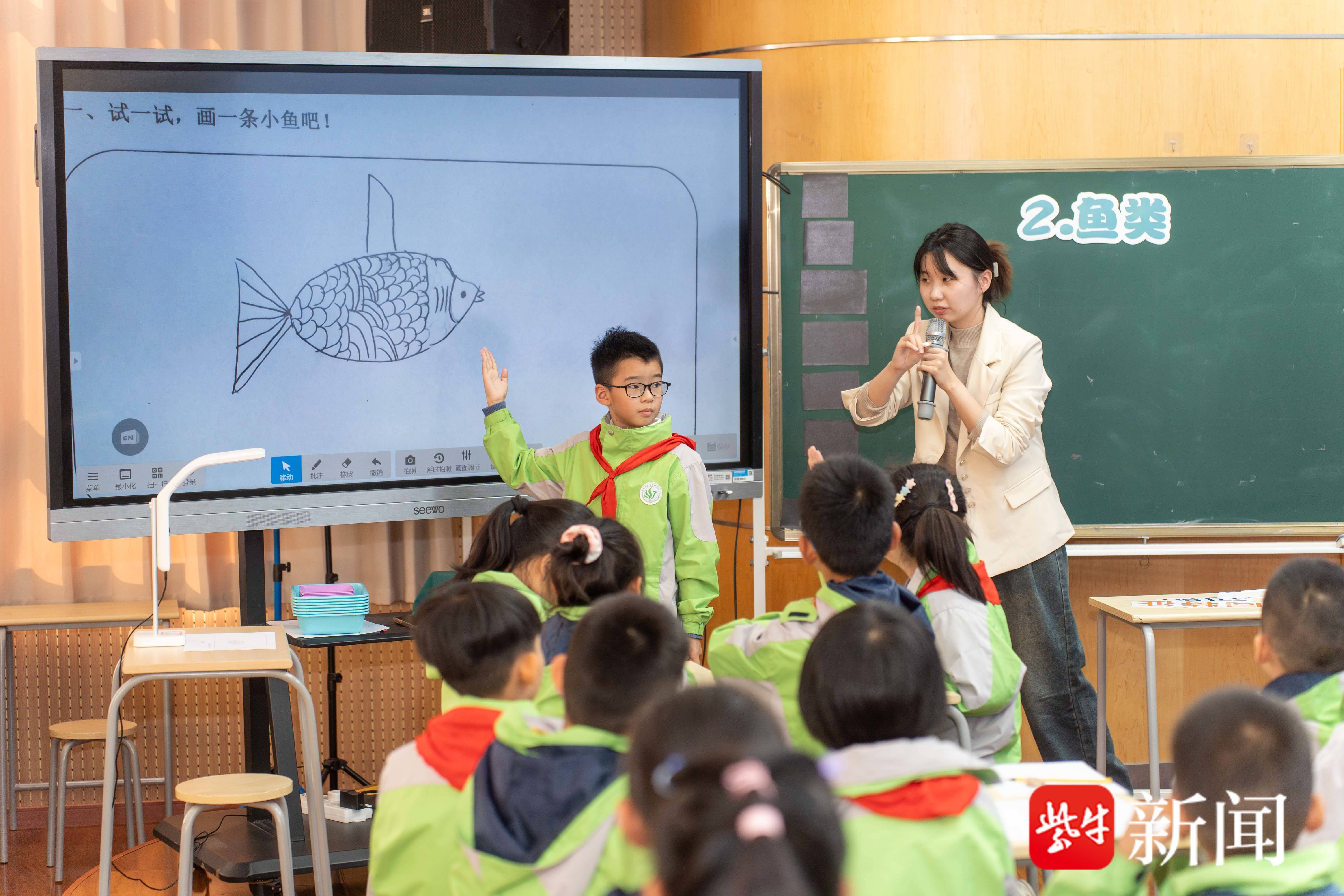 “腮”可以作为我们判断是否是鱼类的特征吗?在科学老师汤晨茜的《鱼类》课堂上,同学们对生活中常见的“鱼”开启了全新的探索。汤晨茜老师引导学生化身“鱼类鉴定小专家”,通过画图猜想、图片验证、实物观察、AI模拟实验等环节,层层递进探究鱼类的核心特征。一条浮现在大屏中的AI金鱼,生动呈现了当金鱼失去鱼鳍之后,东倒西歪无法再游动的结论,紧紧抓住了孩子们的注意力,也让嘉宾们看得目不转睛。