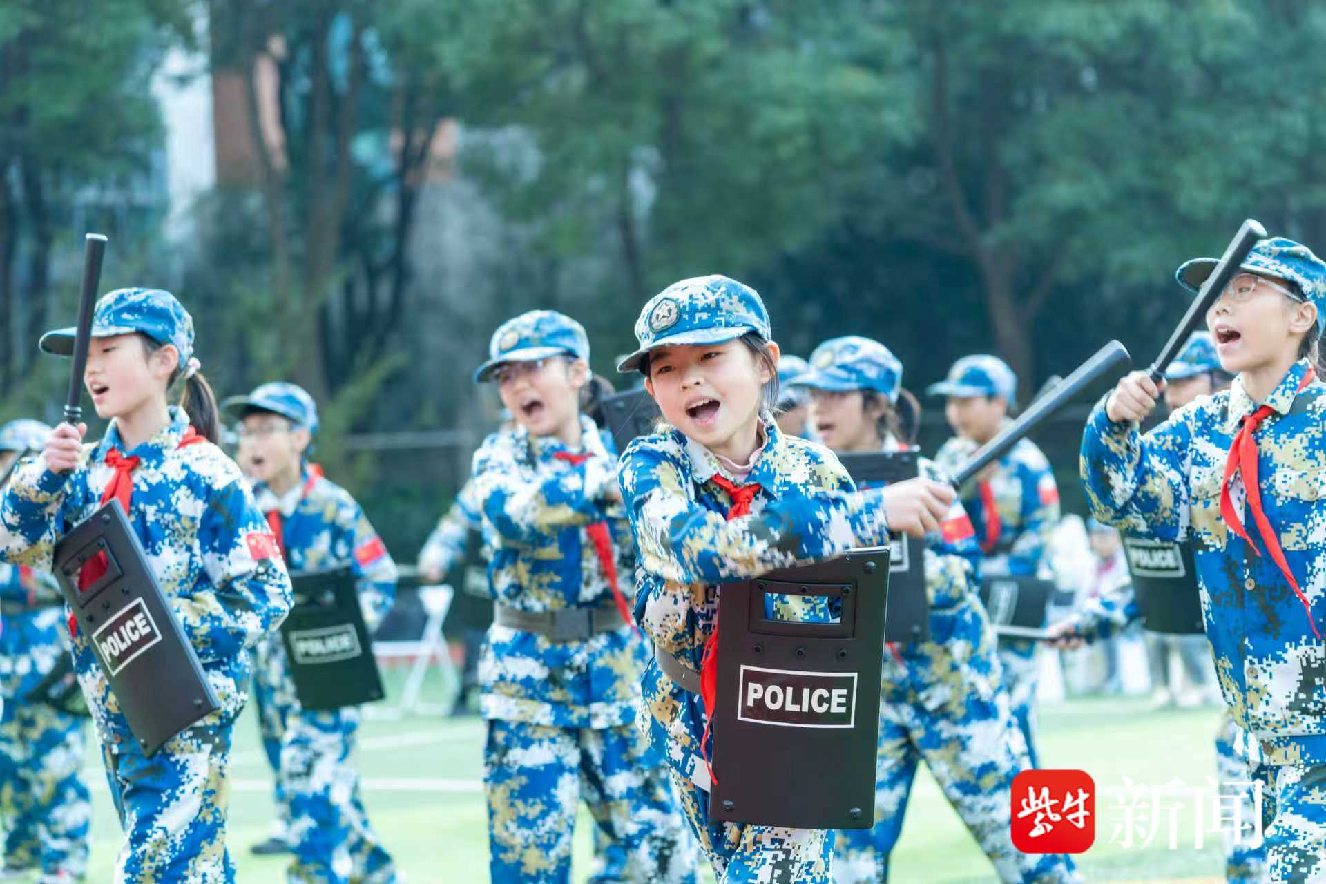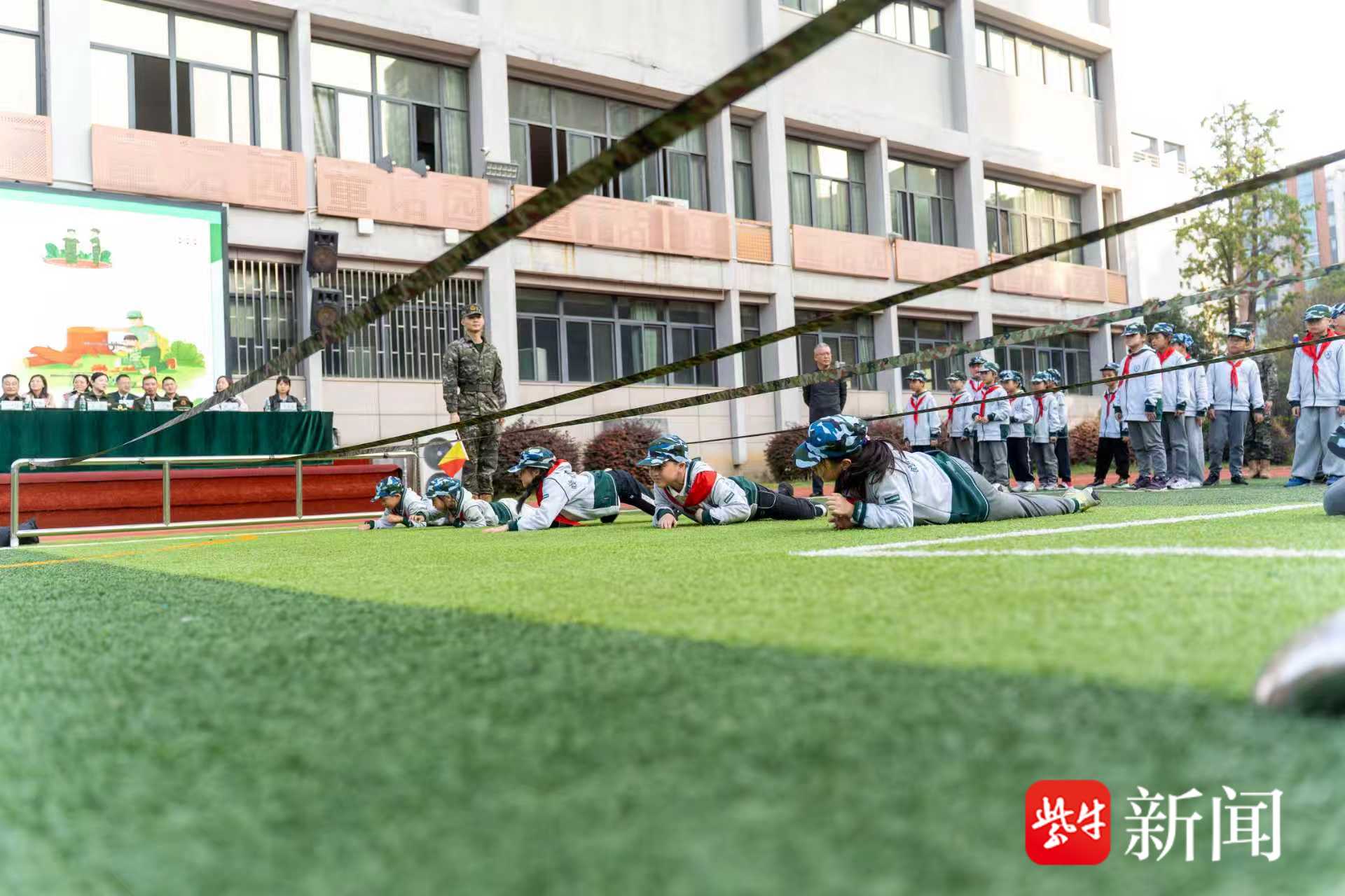 活动伊始,无人机在空中精准悬停,以科技语言诠释了现代国防的魅力,引来学生阵阵惊呼。在随后的方阵展示中,五年级学生的旗语操、警盾术动作刚劲,俨然“小战士”模样。三年级学生则进行了匍匐越障、模拟射击等军事动作展示,萌娃们稚嫩的脸庞上满是专注与坚毅。