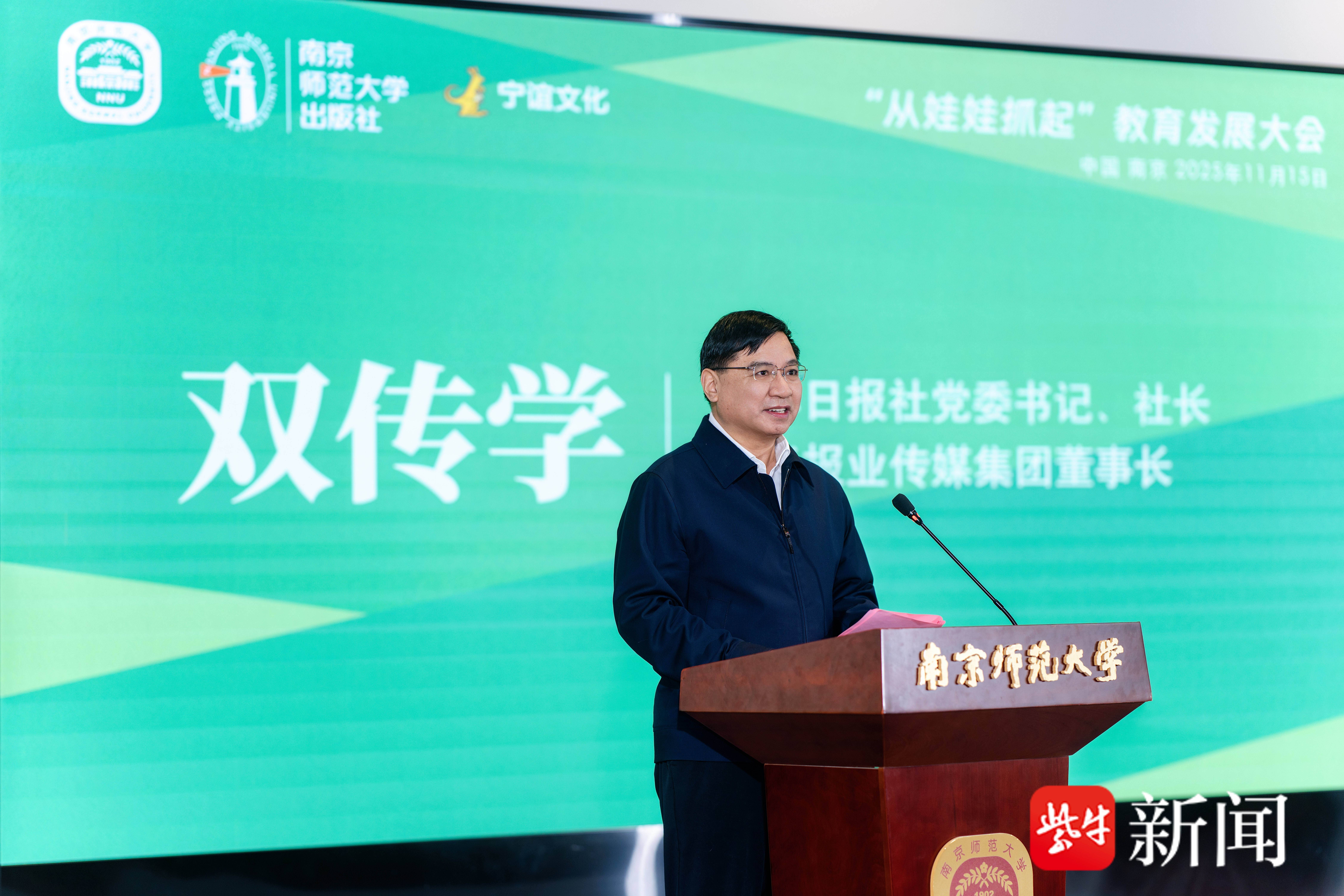 “立足新时代新方位,主流媒体要放大‘教育好声音’,为教育强国建设贡献智慧与力量。”新华日报社党委书记、社长,新华报业传媒集团董事长双传学详细介绍了集团“融媒+教育”的创新实践。他表示,集团始终坚持守正创新,做党的教育方针的坚定传播者;智媒赋能,做教育高质量发展的积极推动者;躬身践行,做时代新人培育的主动服务者。本周,国家新闻出版总署正式批复,同意创办《新华少年报》,集团以新华云教育为主体,全面建设“线上少年志、手中少年报、线下少年团”三位一体的教育服务新生态,“我们将与南京师范大学出版社等社会各界一道,共同为培养德智体美劳全面发展的社会主义建设者和接班人而努力奋斗!”
