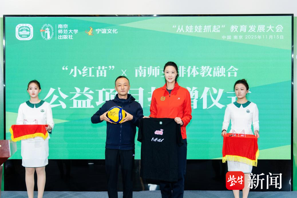 现场,江苏省托育事业发展促进会会长祁爱平、江苏省学前教育学会会长张建明为江苏省托幼产教融合共同体揭牌。女排奥运冠军、南京师范大学体育科学学院副教授惠若琪在排球上郑重签名,并与南京师范大学出版社党委副书记、副社长徐锐交换纪念队服。