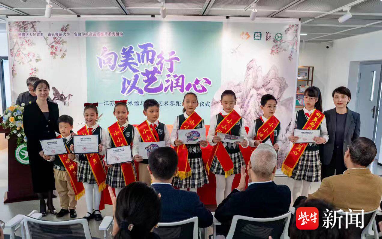 活动现场,“乐雅小小讲解团”正式上岗成为最动人的风景。江苏省美术馆副馆长陈岚和栖霞区教育局副局长陈婷婷共同为“乐雅小小讲解员”颁发绶带。经过多轮系统培训,孩子们落落大方地站在展品前,将画作背后的故事娓娓道来,成为连接艺术与观众的“小桥梁”。