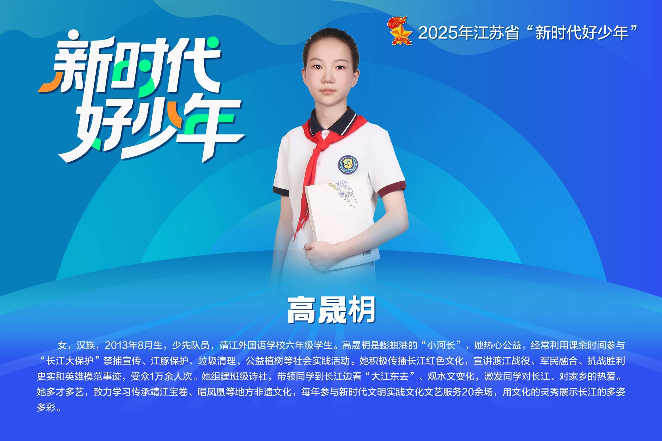 泰州靖江市外国语学校六年级学生高晟枂生于长江之畔,自小就深受长江文化滋养,凭借对家乡与长江的热爱,积极投身“长江大保护”禁捕宣传、江豚保护、垃圾清理。今年8月,她成功获评2025年江苏省“新时代好少年”。