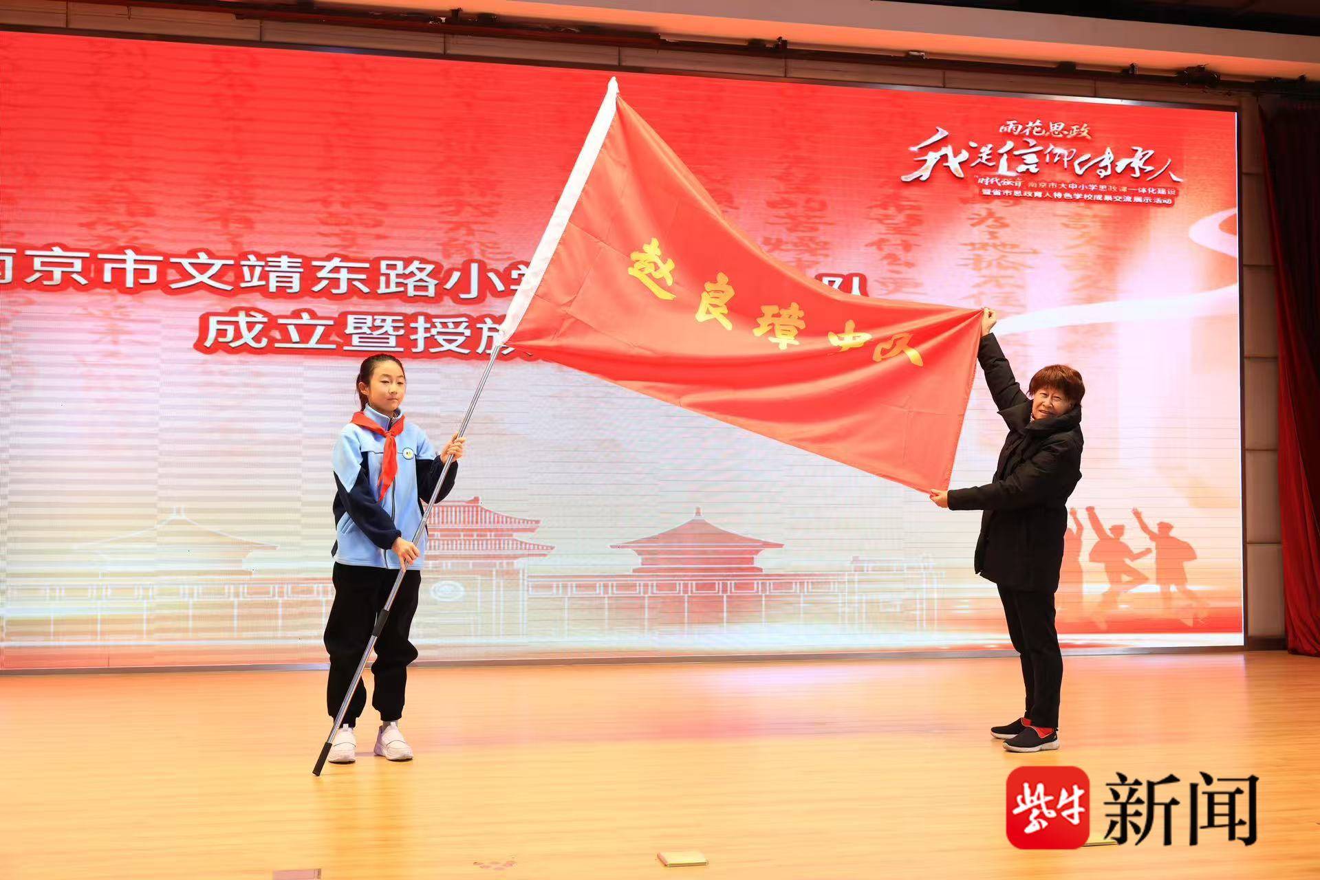 活动现场,两场意义非凡的授旗仪式相继举行,将现场氛围推向高潮。由江宁区、雨花台区、高淳区、溧水区联合组建的“小雨滴”志愿服务队校园分队正式成立,未来,他们将一起以“小雨滴”之名,走进场馆讲解红色故事、在校内开展思政实践。随后,“赵良璋中队”成立暨授旗仪式庄重启幕。赵良璋烈士后人徐彩平将队旗郑重交予中队代表。