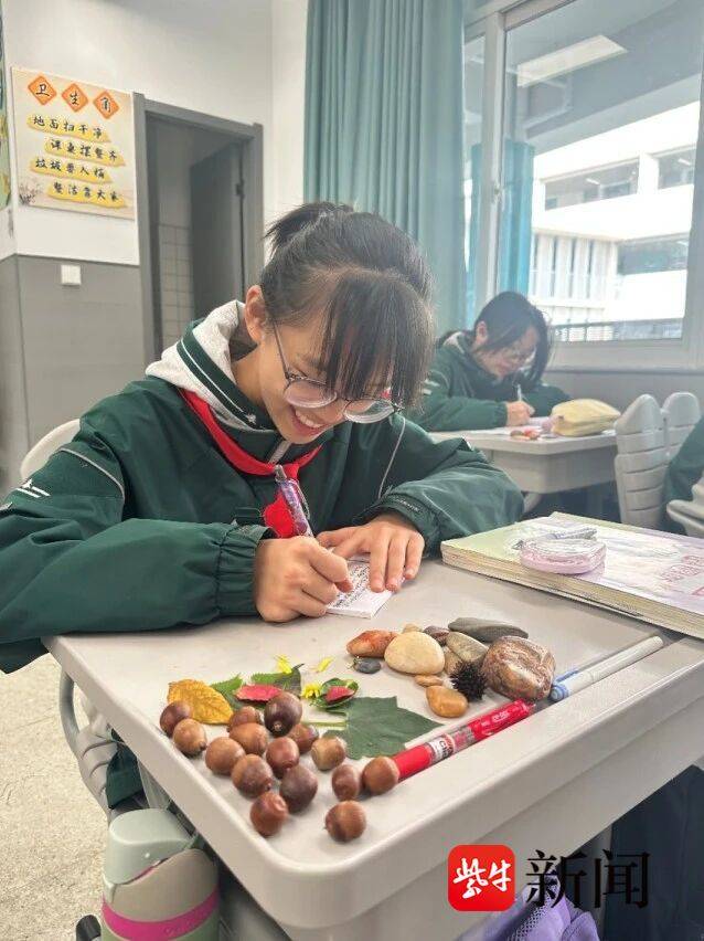 校长栾娟告诉记者,孔子“习礼大树下,授课杏林旁”的教育场景,现代建筑大师易·康“学校起源于一个人在一棵树下”的诗意阐述,这些理念都深深影响着附中雨花的设计。同时,学校的办学还得到雨花台区政府、雨花台区教育局、赛虹桥街道的支持,将南山纳入学校的活动课程教学基地。附中雨花正在依托南山开发跨学科课程,将课堂延伸至森林。“在这里,跨学科不是生硬的拼盘,而是自然生长的果实。当孩子们用捡来的橡子壳回家熬煮绘画的染料,在秋叶上创作诗句时,我们会发现:最好的教育,是让知识像南山上的树木一样,在阳光下自由生长。”