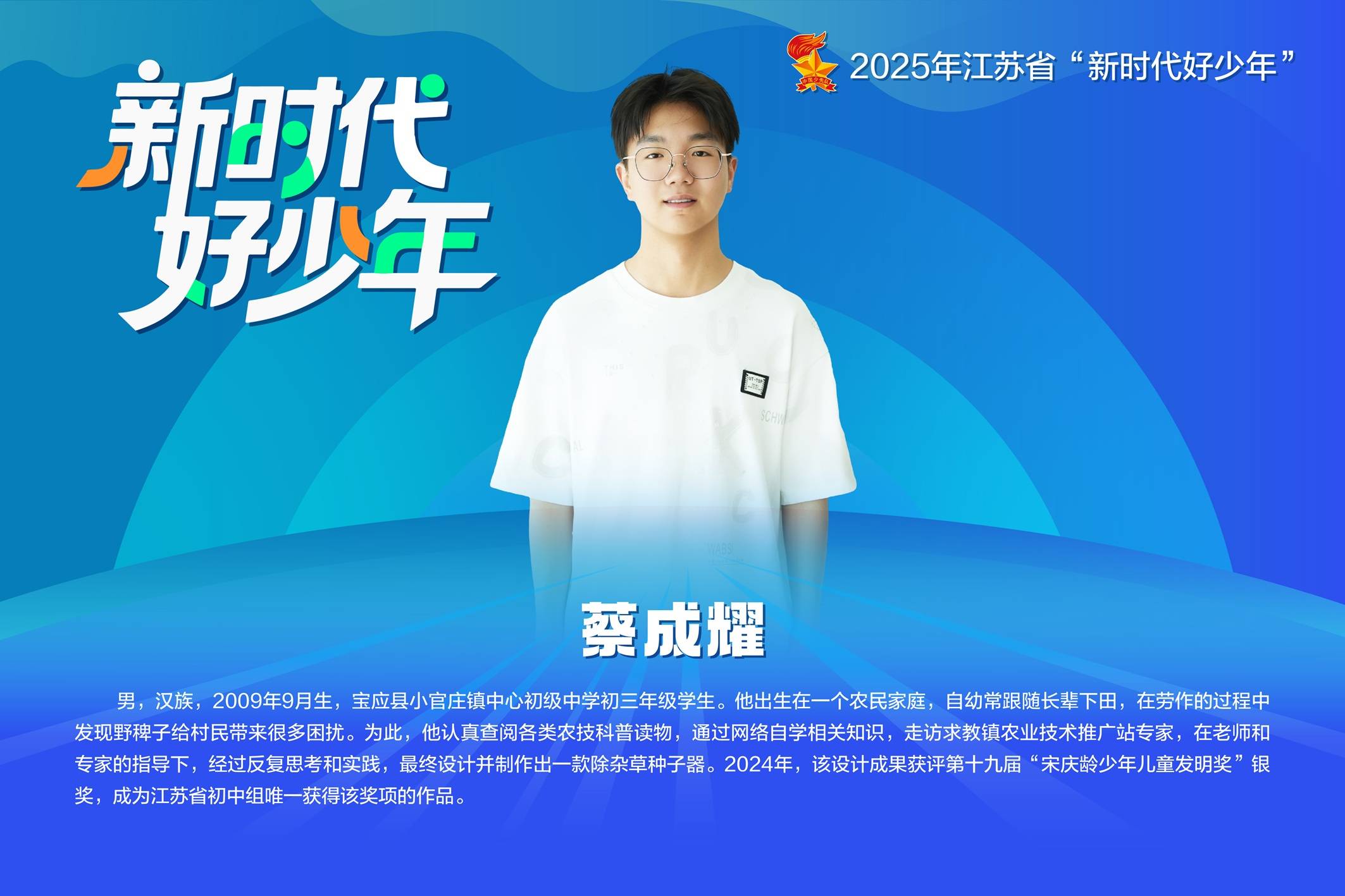 “袁隆平爷爷许下禾下乘凉梦,我也有一个梦想,希望在科技发展助力下,新时代的农民能够一键完成各类农业生产。”扬州市宝应县小官庄镇中心初级中学初三学生蔡成耀,用一款自制的除杂草种子器,圆了自己的“强农梦”。这个出身农民家庭的少年,因心疼奶奶田间除草的辛劳,历经反复试验研发出实用农具,不仅获得第十九届“宋庆龄少年儿童发明奖”银奖,成为江苏省初中组唯一获奖选手。今年8月,他成功获评2025年江苏省“新时代好少年”。