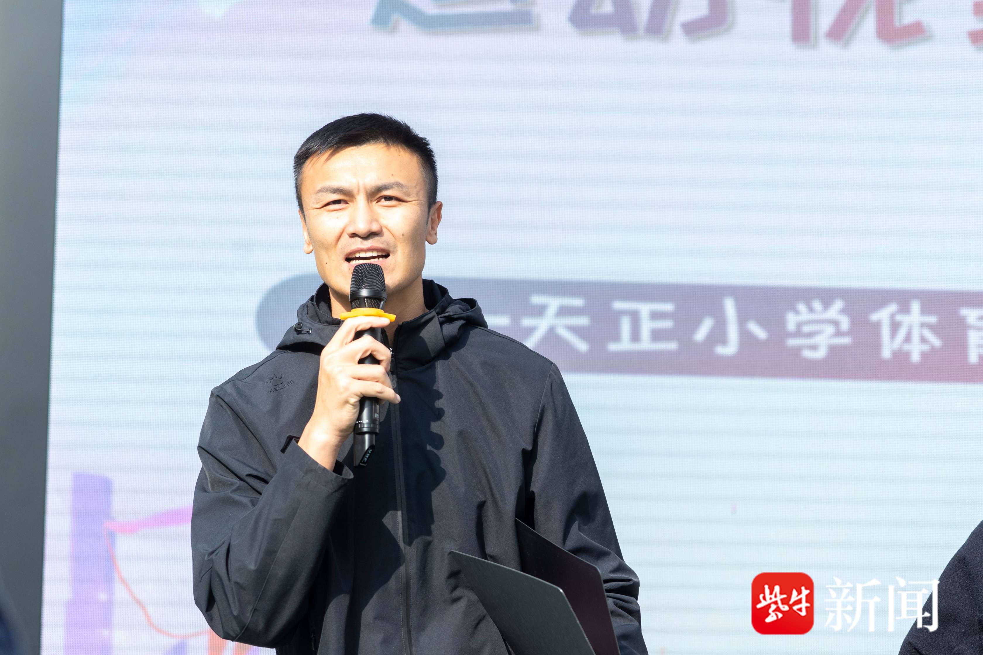 “苏超”南京队球员戈伟、滕帅与天正小学足球校队成员牵手进场,全场瞬间爆发热烈掌声。戈伟在发言中分享了与天正小学的不解之缘——11月2日在奥体中心的“苏超”决赛现场,天正童声合唱团的纯净歌声曾给予球队满满的温暖与鼓舞。他回忆起儿时在操场奔跑的时光,感慨足球不仅教会他运球的技巧,更让他拥有了跌倒再爬起的勇气、并肩作战的协作能力与全力以赴的坚持。“运动不分高低,热爱就是起点”,戈伟鼓励同学们珍惜每一次奔跑与尝试,将运动热爱化为成长力量。