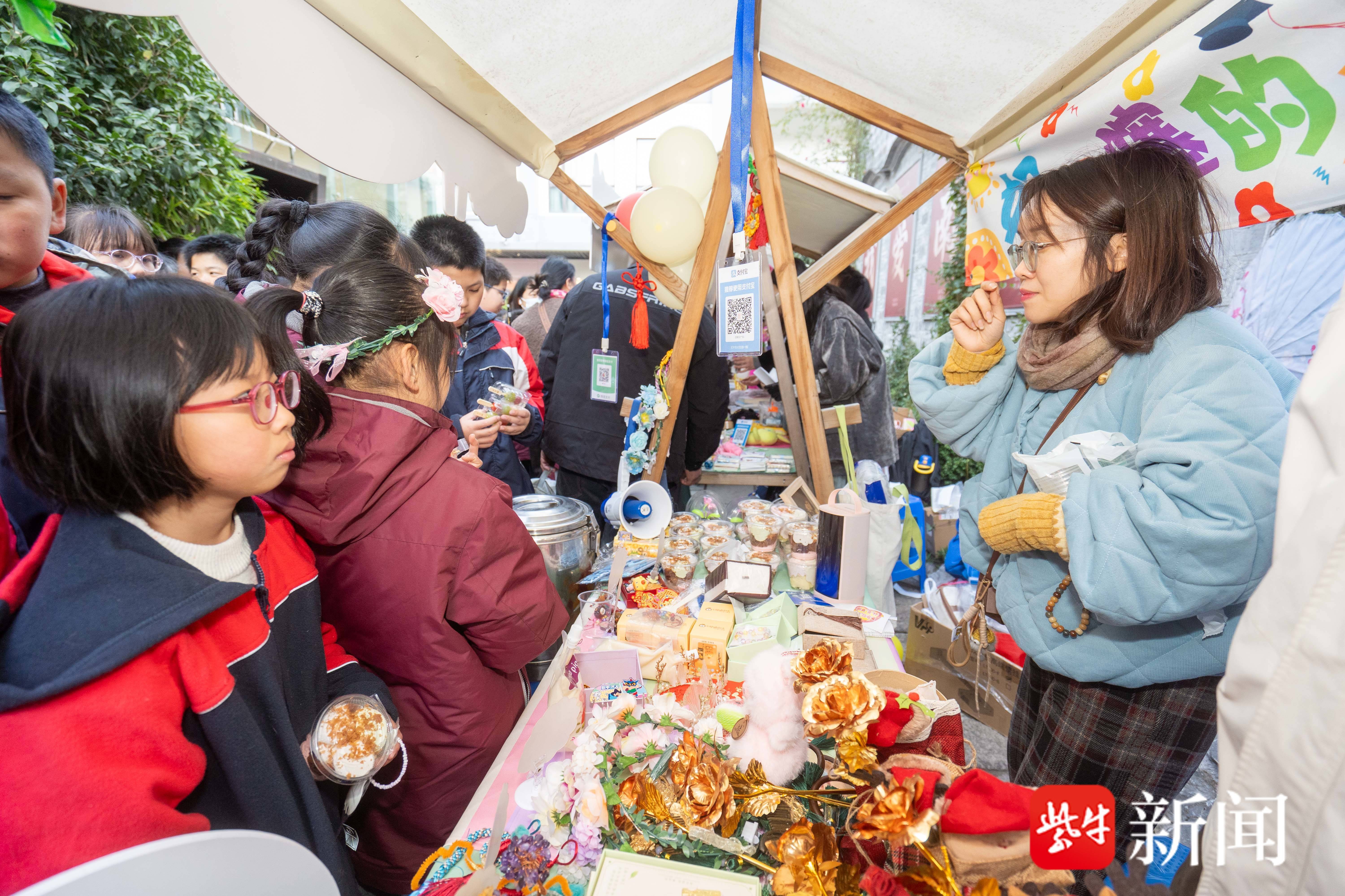 简短的开幕式之后,爱心义卖热闹开集。本次义卖作品大多出自朝天宫民族小学同学们的非遗课堂,有精美的剪纸、灵动的泥塑、雅致的书画等。这些作品不仅是同学们匠心创作的心血结晶,更承载着对中华优秀传统文化的热爱。摊位名称、宣传海报及广告语巧妙融合传统文化元素,吸引了不少市民驻足。除了非遗摊位,现场还有酒酿元宵、糖画、爆米花等热腾腾的美食,人间烟火气,最抚凡人心。孩子们化身小小“推销员”,热情地向顾客推介,现场氛围异常热烈。