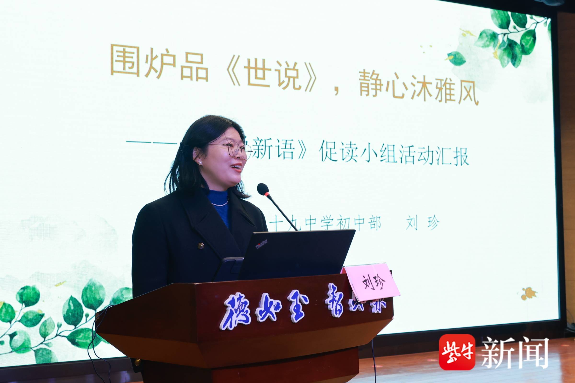 南京市第二十九中学初中部语文教研组长、南京市中小学生中华优秀传统文化经典领读人刘珍老师以《围炉品〈世说>,静心沐雅风》为题,分享了促读活动经验。刘老师介绍,本次经典促读活动是去年领读活动的延续。学生在个人自读的基础上分组进行专题研读,创意表达,成果展示。刘老师还提出了“今天我们为什么要读经典”“如何消除学生与经典的隔膜”“保护阅读趣味与推进阅读深度能否两全”等引人深思的问题,引发了大家的进一步思考。