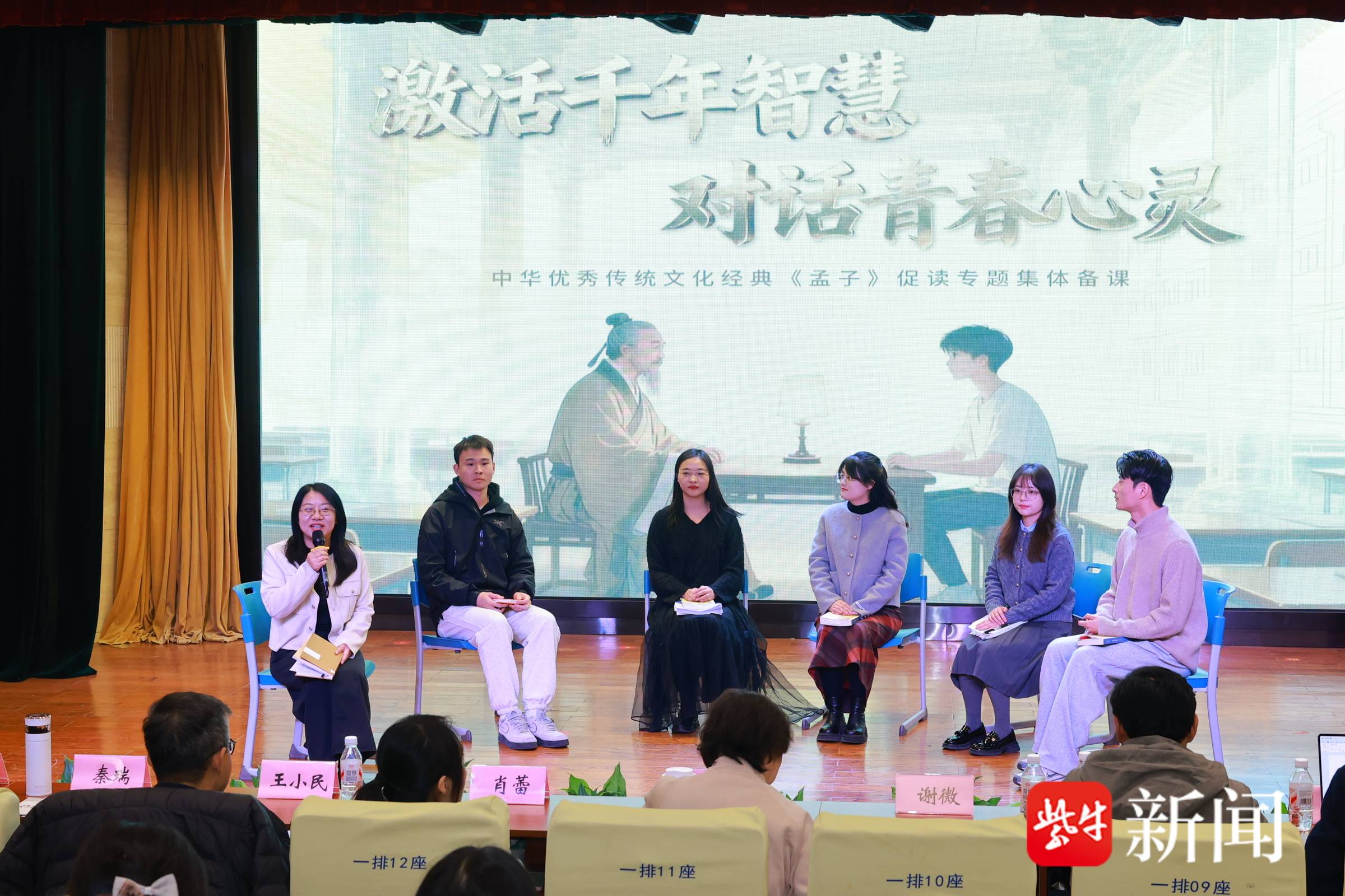 南京市中小学生中华优秀传统文化经典领读人、浦口外国语学校高新分校徐海燕老师携小组成员贾劼晗、郭冬婷、陈红、李星卉、徐洁老师带来《〈孟子〉促读小组集体备课展示》。他们围绕《孟子》的核心思想与促读策略展开热烈讨论。团队的老师各抒己见,在思想的碰撞中凝聚集体智慧,设计促读方案。