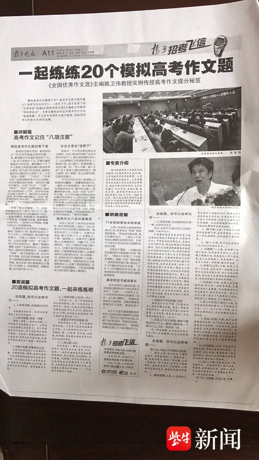 这个称呼变化的背后,是2010年5月24日《扬子晚报》A11版那篇整版报道——《一起练练20个模拟高考作文题》。时任《全国优秀作文选》主编的姚卫伟在报道中为考生实例传授作文提分秘笈。正是这篇报道,让这位深耕语文教育领域的专家,从邻里眼中普通的“师傅”,变成了备受尊敬的“姚教授”。