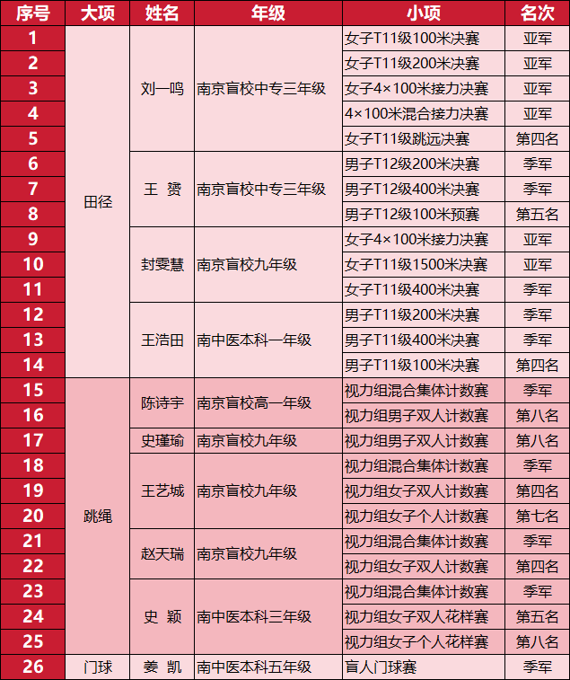 赛事期间,盲校和南中医视障健儿们奋勇争先,屡创佳绩:在田径、跳绳、门球三大项赛事中,收获6银10铜,10人次跻身第四至第八名;6名南京盲校优秀毕业生更强势斩获5金5银3铜的好成绩。