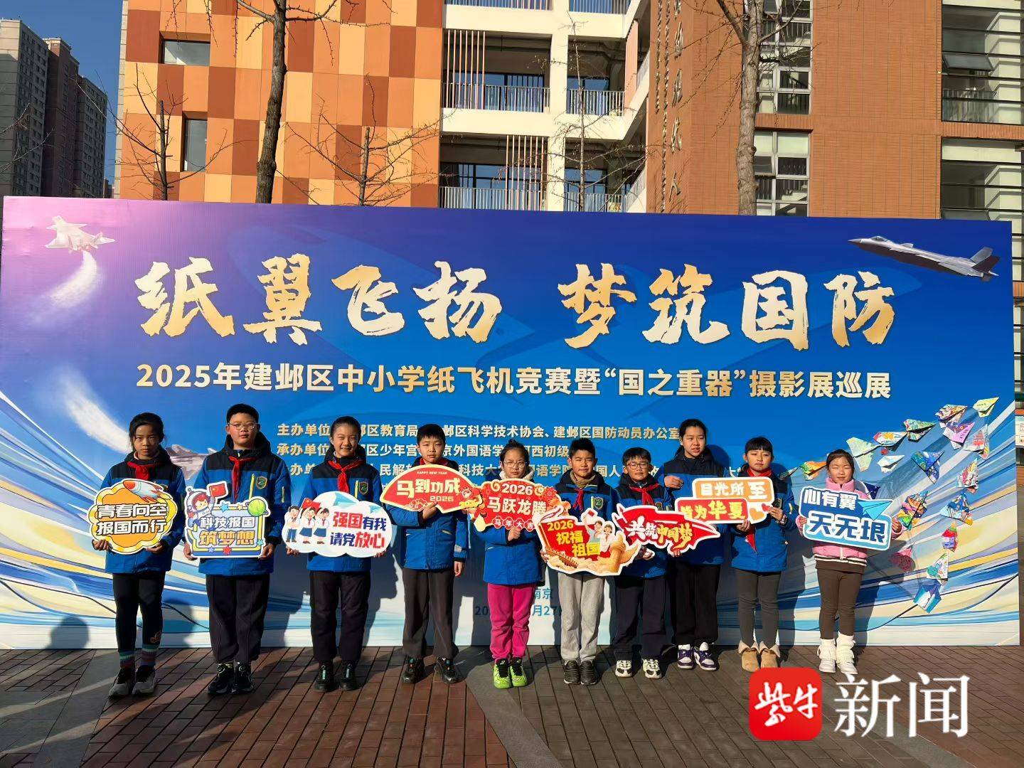 12月27日上午,“纸翼飞扬・梦筑国防”2025年南京市建邺区中小学纸飞机竞赛暨国之重器摄影展巡展活动在南京外国语学校河西初级中学顺利举办。本次活动由建邺区教育局、建邺区科学技术协会、建邺区国防动员办公室主办,建邺区少年宫、南京外国语学校河西初级中学承办,中国人民解放军国防科技大学外国语学院、中国人民解放军陆军工程大学、江苏省航空运动协会、建邺区各中小学协办。