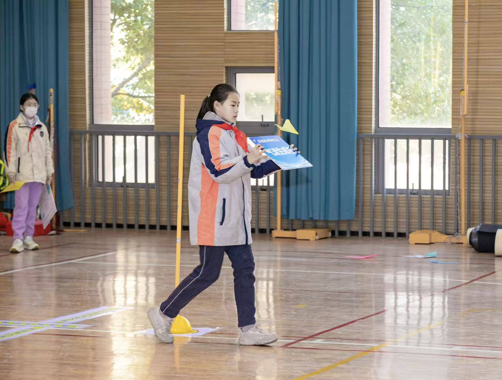 在投掷飞机比赛中,新城小学南校区李文博投出了18.6米的成绩。“我觉得飞机要折得小一点、长一点,往上45度角投掷,不要太用力,不然飞机会偏的。”