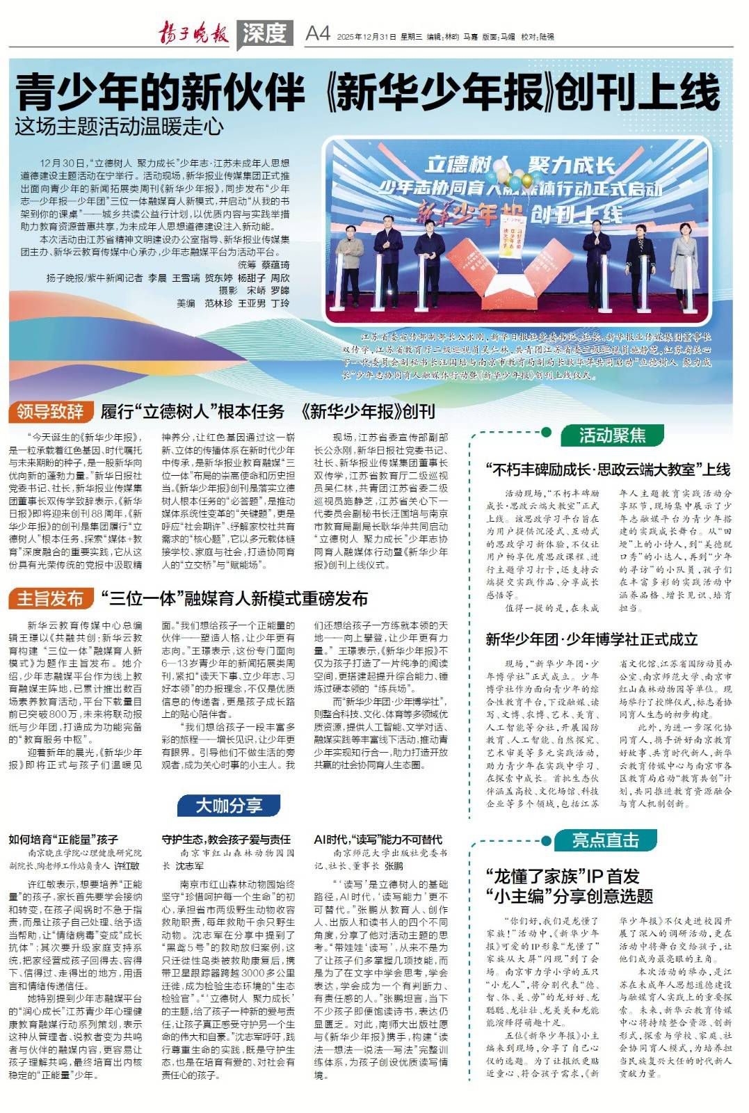 12月30日,“立德树人 聚力成长”少年志·江苏未成年人思想道德建设主题活动在宁举行。活动现场,新华报业传媒集团正式推出面向青少年的新闻拓展类周刊《新华少年报》,同步发布“少年志-少年报-少年团”三位一体融媒育人新模式,并启动“从我的书架到你的课桌”—城乡共读公益行计划,以优质内容与实践举措助力教育资源普惠共享,为未成年人思想道德建设注入新动能。