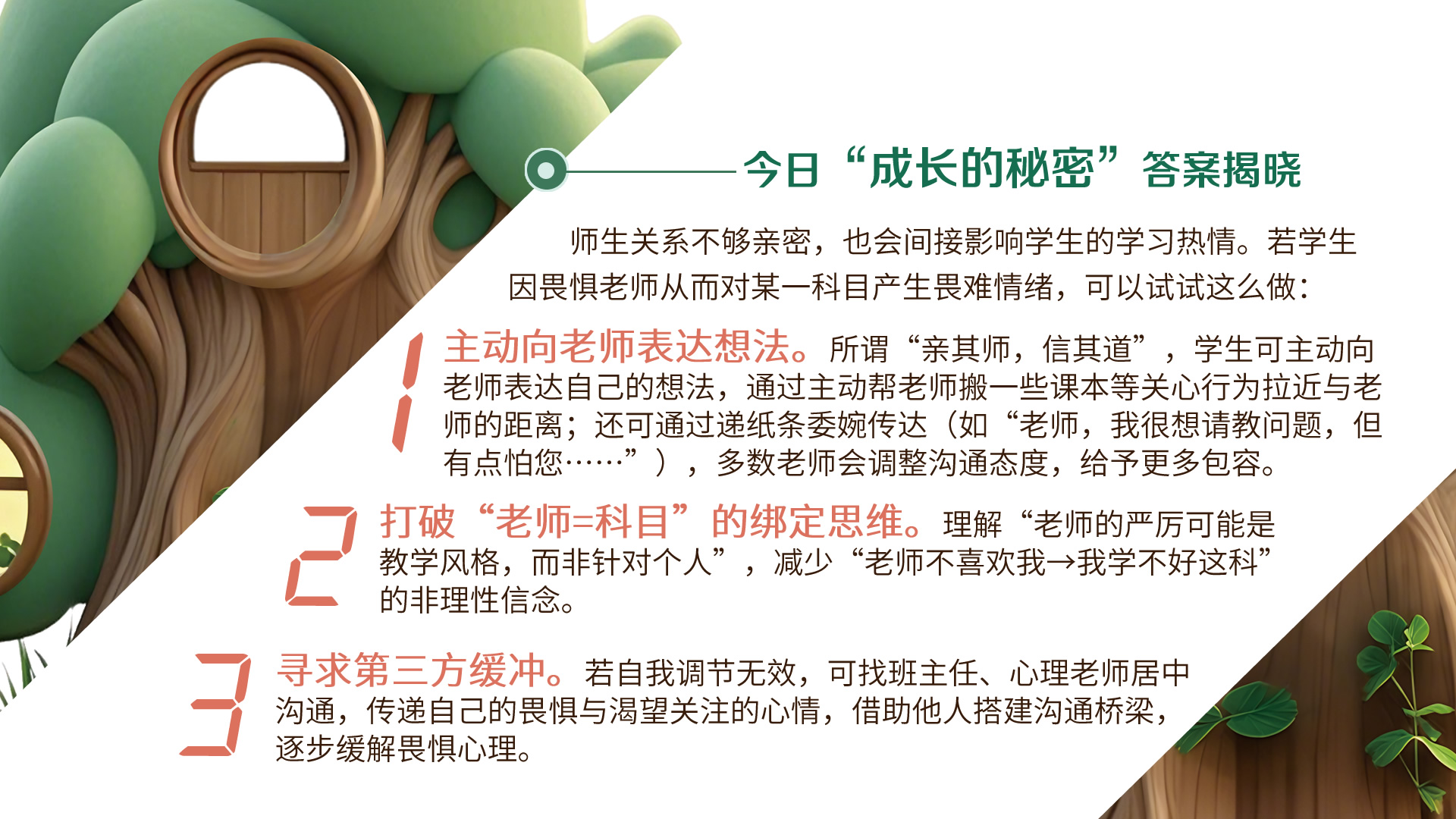 针对师生关系疏离引发的学习畏难情绪,MV配套的“成长的秘密”给出实用解法:学生可通过主动关心老师、递纸条委婉表达想法拉近距离;要打破“老师=科目”的绑定思维,理解严厉是教学风格而非针对个人;若自我调节无效,可寻求班主任或心理老师居中沟通。“成长导师团”也提醒,和谐的师生关系是学习动力的重要源泉,双向理解才能让课堂更有温度。