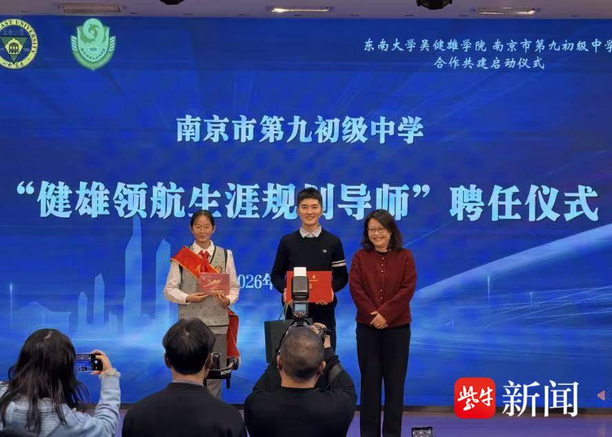 九初向首批受聘的吴健雄学院5位“健雄学子”颁发“健雄领航辅导员”聘书,他们将定期走进九初,开展学业辅导、科创分享等活动;为东南大学吴健雄学院团委书记刘欢欢颁发“健雄领航生涯规划特聘导师”聘书,助力吴健雄班学子获得专业的生涯规划指导。